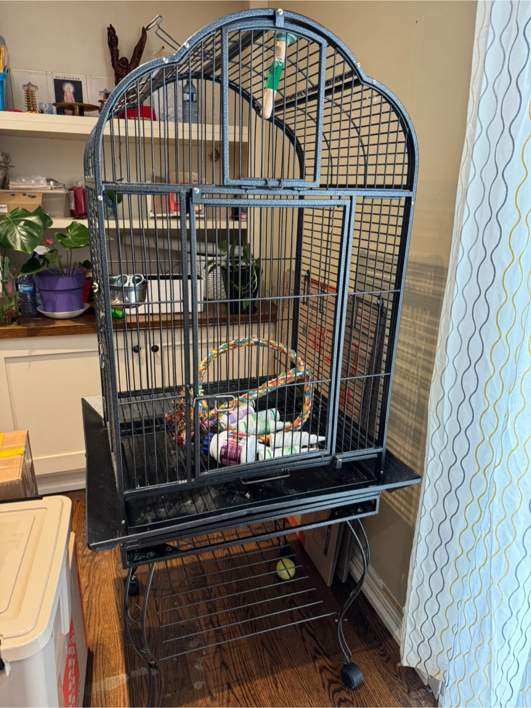This is a large, black metal bird cage, comes with a stand and a perch inside. It's suitable for various bird sizes. The cage features multiple doors and a pull-out tray for easy cleaning. It also includes a colourful rope toy. 150 cm H, 60 cm W, 60 cm L