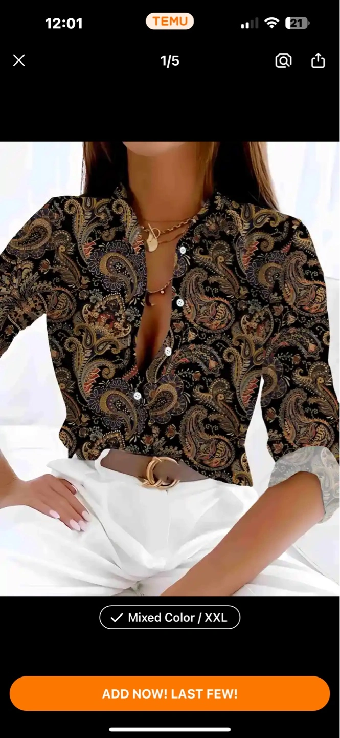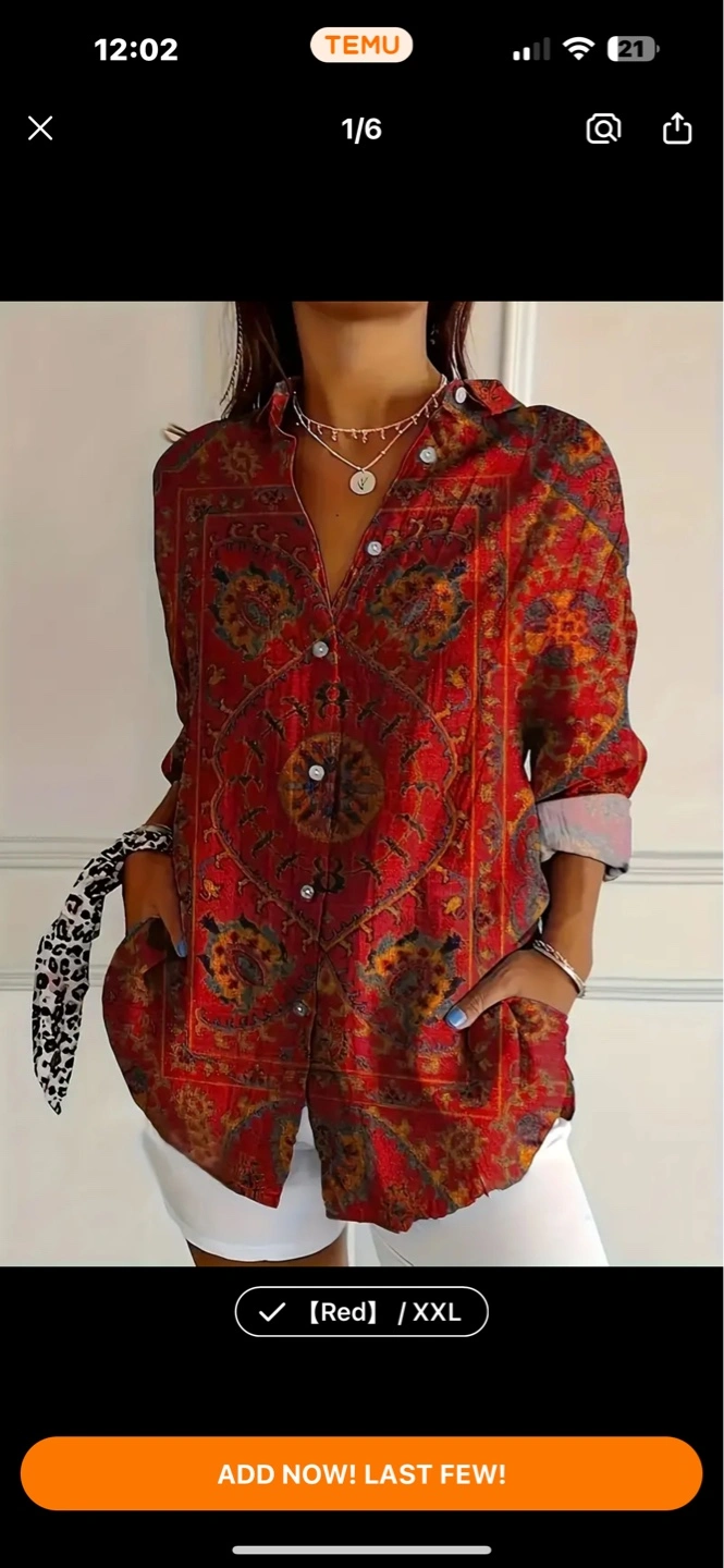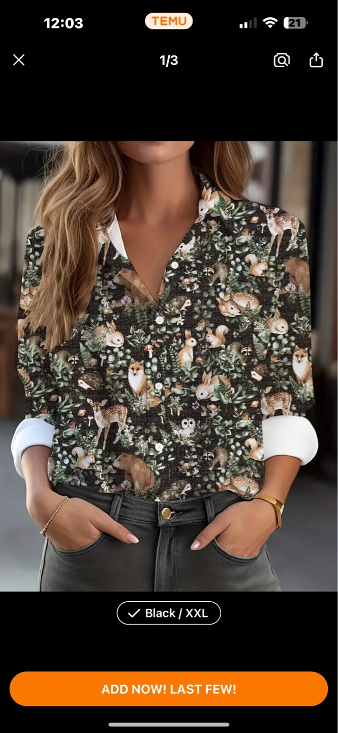 Collection of women's button-down shirts. Size XXL. Various colourful prints available: red patterned, black skull and floral, black floral, black woodland animals, and black paisley. Long sleeves. Excellent for casual wear. Open to offers.