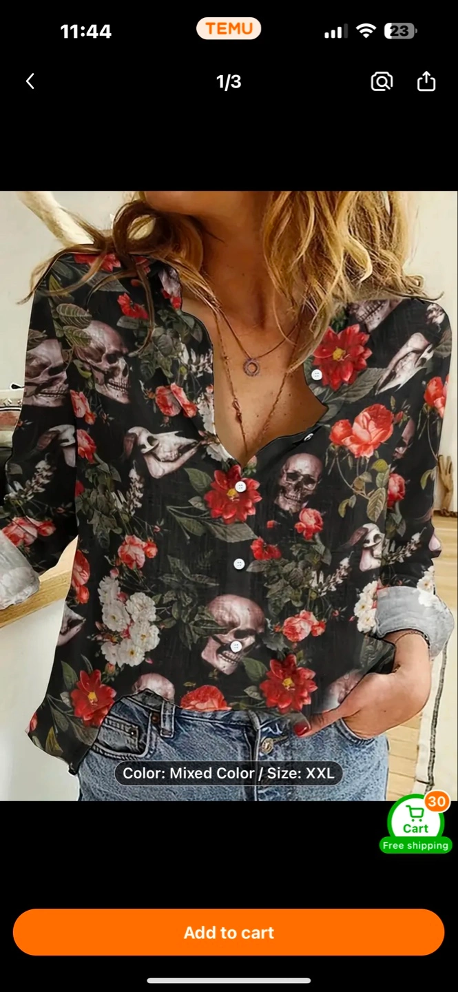 Collection of women's button-down shirts. Size XXL. Various colourful prints available: red patterned, black skull and floral, black floral, black woodland animals, and black paisley. Long sleeves. Excellent for casual wear. Open to offers.