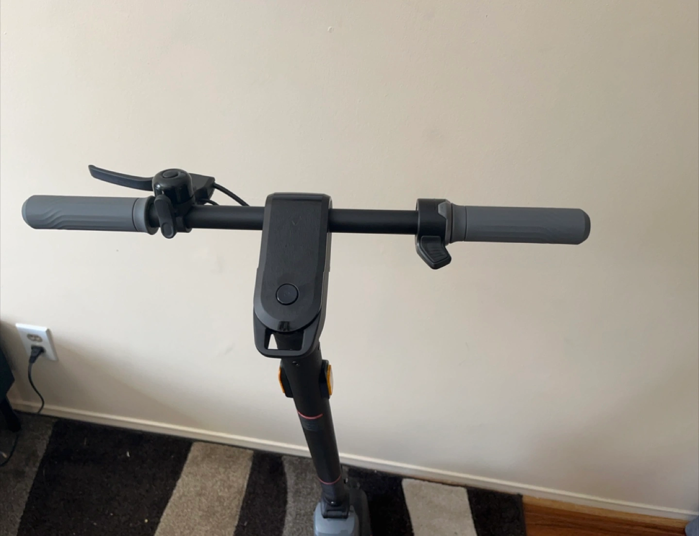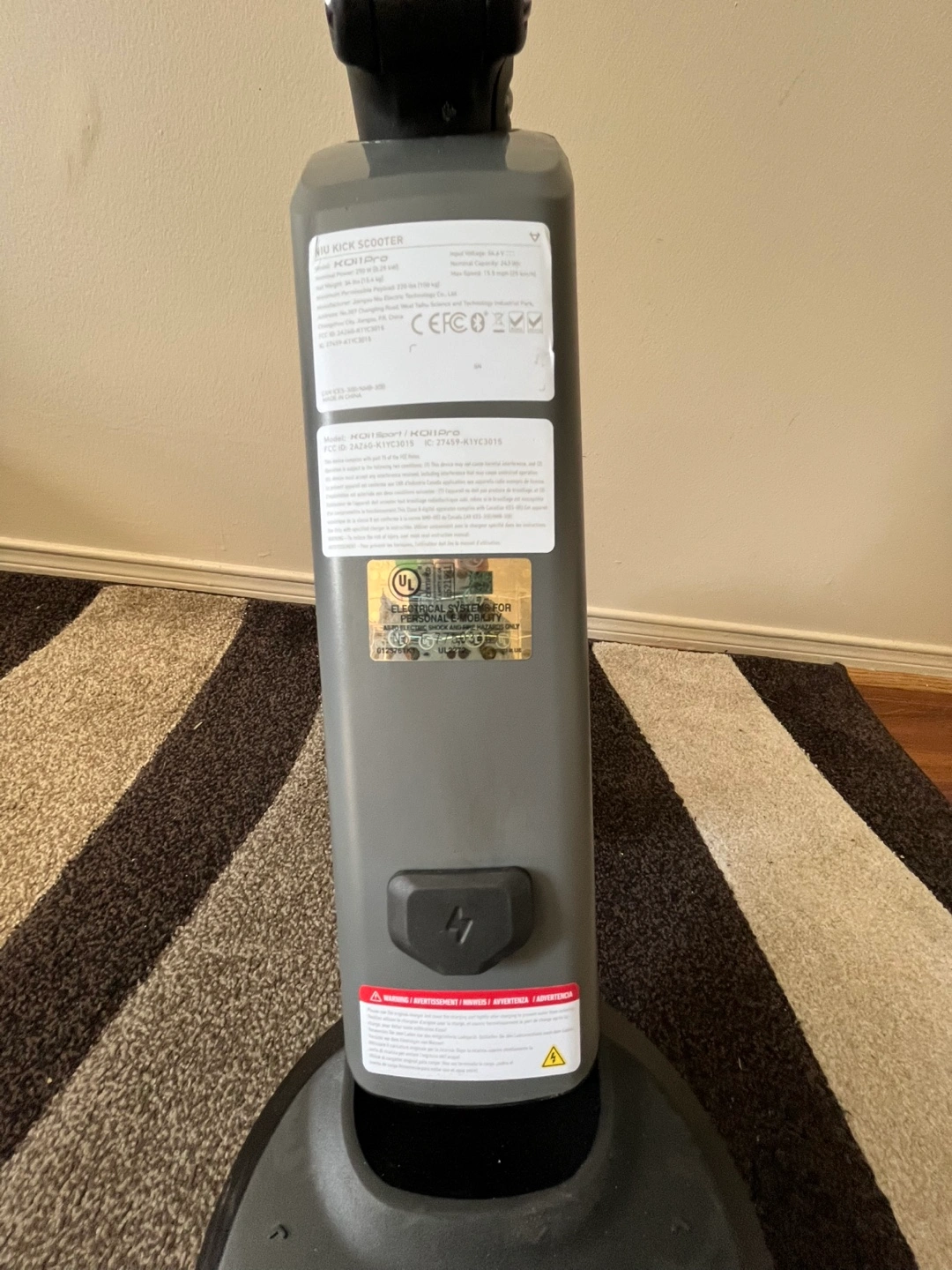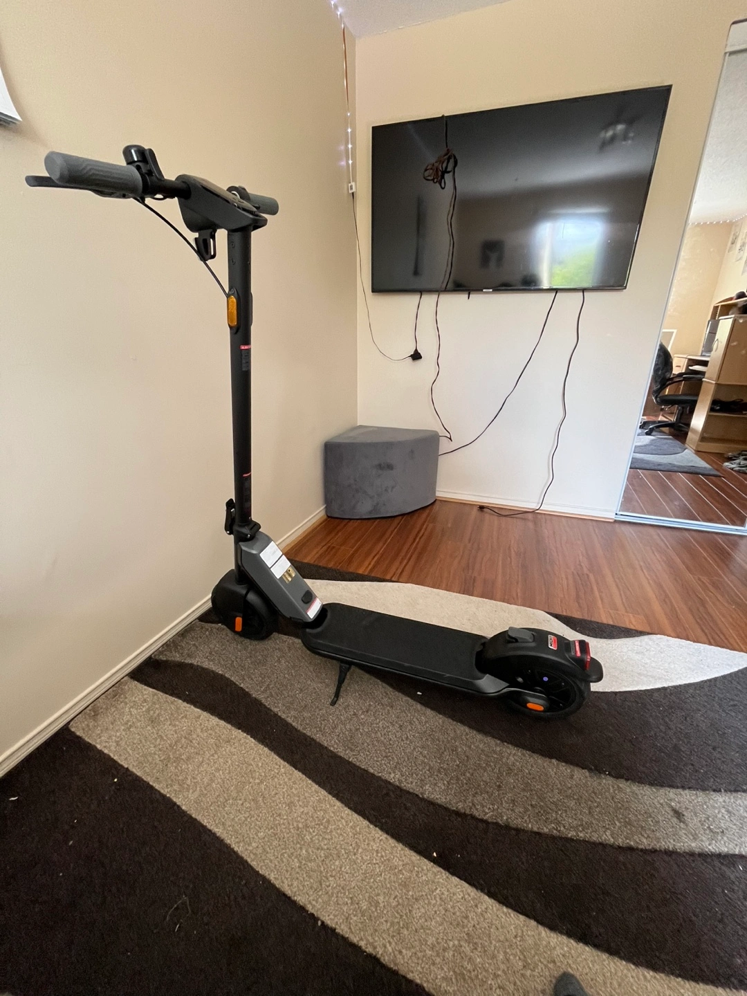 Electric scooter, black and grey. Features a digital display, bell, and rear brake light. Good condition, minor wear Speed: 25KM/H Battery Range: 25KM Weight Limit: 100KG 4-5 Hour charging