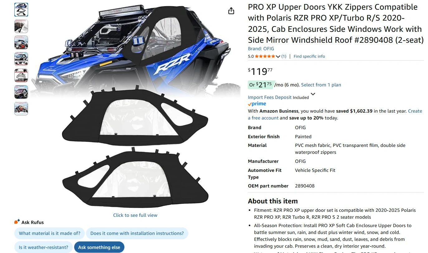 754PRO XP Upper Doors YKK Zippers Compatible with Polaris RZR PRO XP/Turbo R/S 2020-2025, Cab Enclosures Side Windows Work with Side Mirror Windshield Roof #2890408 (2-seat), Brand New in the Box/Sealed Sells for $120+tax on Amazon https://www.amazon.ca/dp/B0F83WL9J9 Features: Fitment: RZR PRO XP upper door set is compatible with 2020-2025 Polaris RZR PRO XP, RZR Turbo R, RZR PRO S 2 seater models All-Season Protection: Install PRO XP Soft Cab Enclosure Upper Doors to battle summer sun, rain, and dust plus winter wind, snow, and cold. Effectively blocks rain, snow, mud, sand, dust, leaves, and debris from invading your cab. Preserves a clean, dry interior year-round. Waterproof Material and YKK Zipper Design: The PRO XP upper door set are consist of PVC mesh fabric, PVC transparent film and double side YKK waterproof zippers. Engineered to resist scratches, tears, fading, and punctures while providing reliable waterproof/windproof/dustproof protection for all-season adventures. Dual-way zippers enable opening/closing the window from inside/outside. Features removable self-adhesive straps + mirror access holes, ensuring full compatibility with most windshields, roofs, and lower doors while extending side mirrors functionality. Quick-Roll Function: Effortlessly roll up the PRO XP enclosure's transparent film and secure with heavy-duty straps. Features drill-free installation using integrated self-adhesive tape and removable webbing. Removes instantly residue-free, preserving your PRO XP's factory finish.