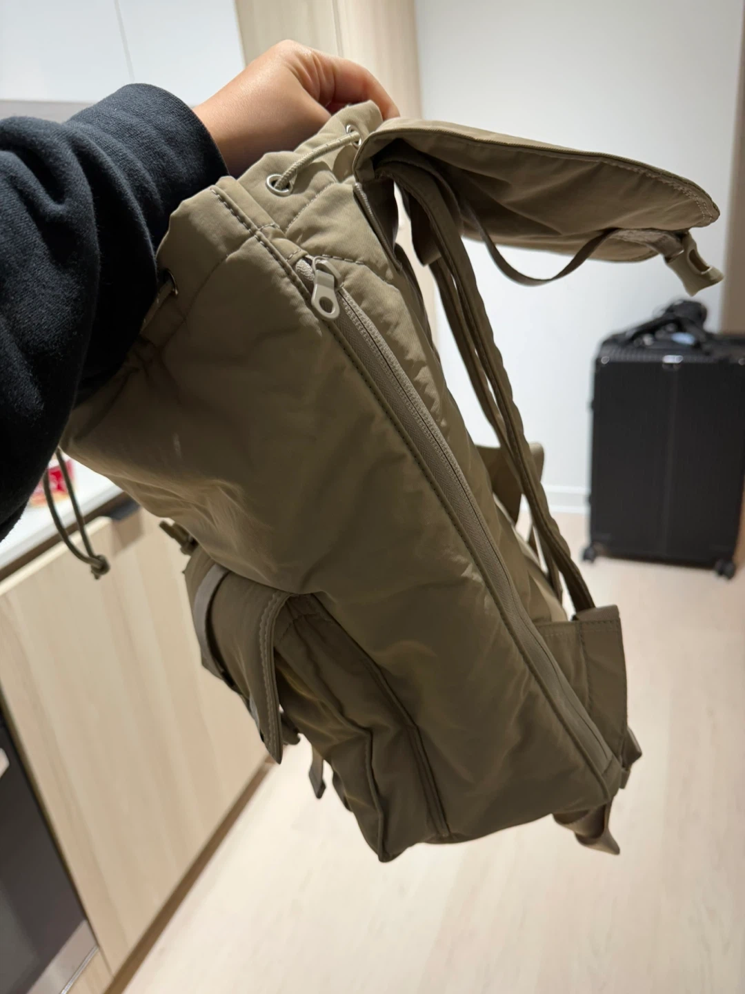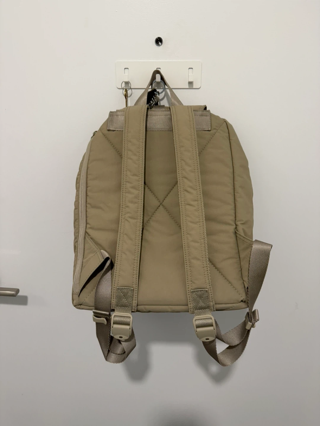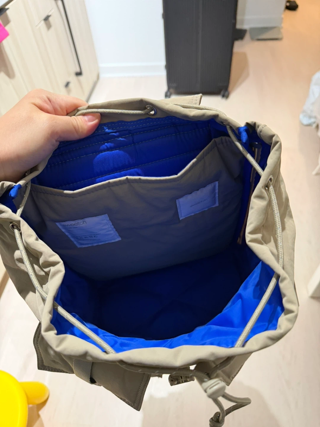 Here's a Sweetch backpack in a lovely beige colour! It's in great condition and ready for a new home. It has a unique design with multiple straps and pockets, perfect for carrying all your essentials. The inside is a vibrant blue colour, adding a pop of fun to the bag