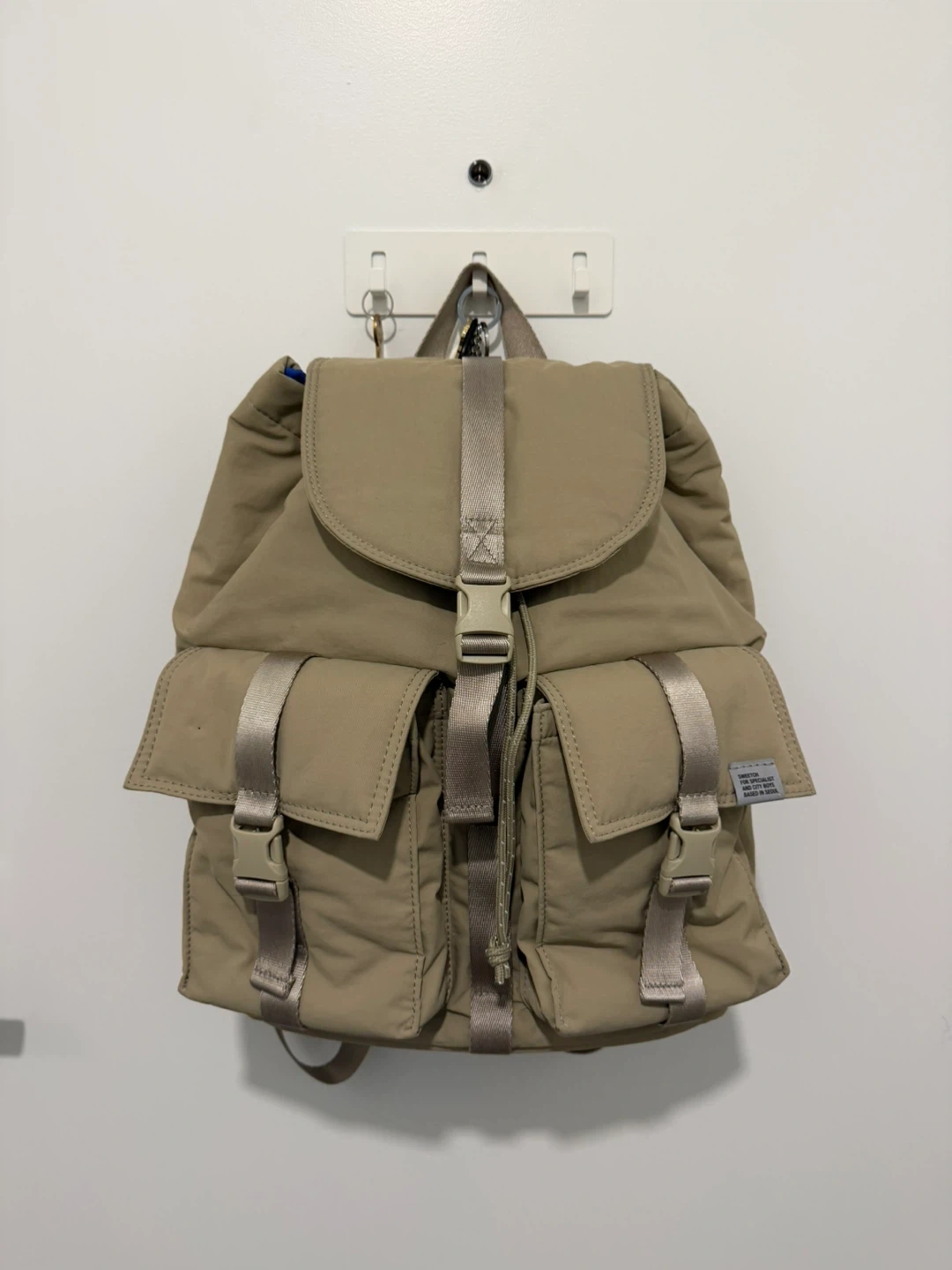 Here's a Sweetch backpack in a lovely beige colour! It's in great condition and ready for a new home. It has a unique design with multiple straps and pockets, perfect for carrying all your essentials. The inside is a vibrant blue colour, adding a pop of fun to the bag