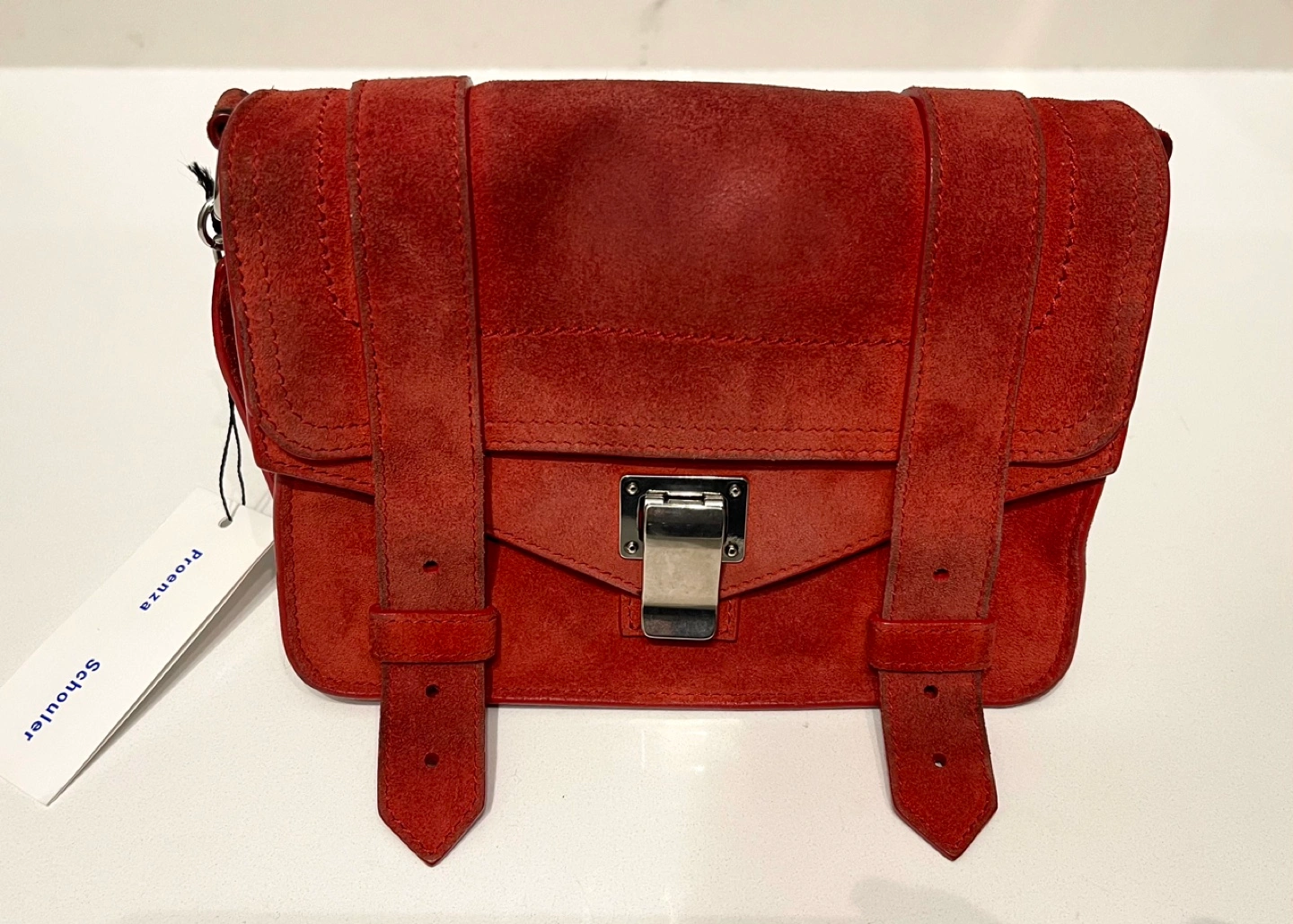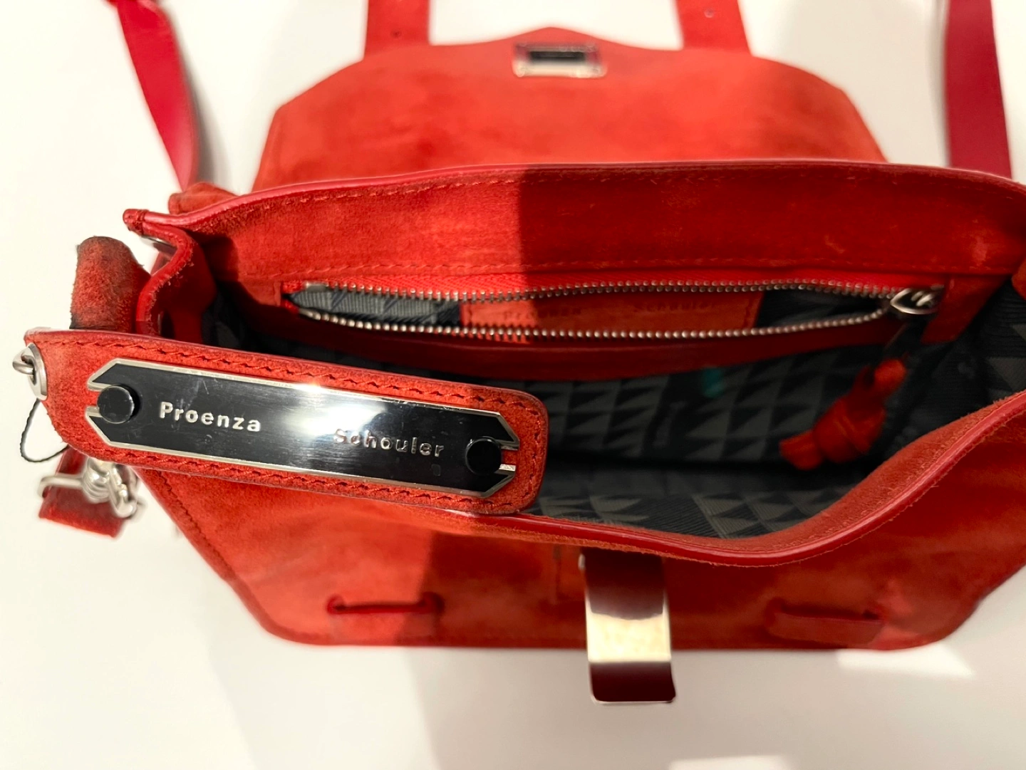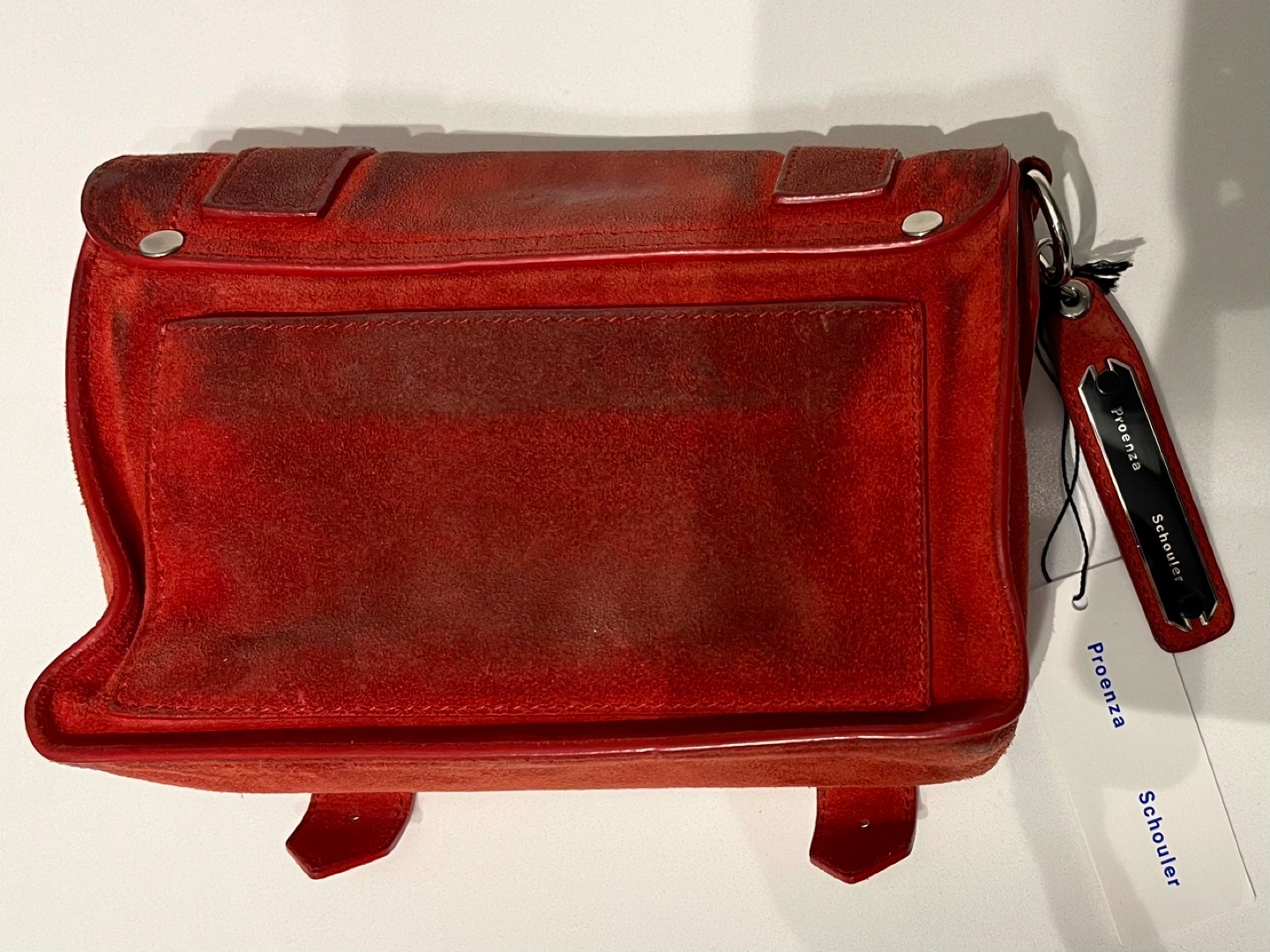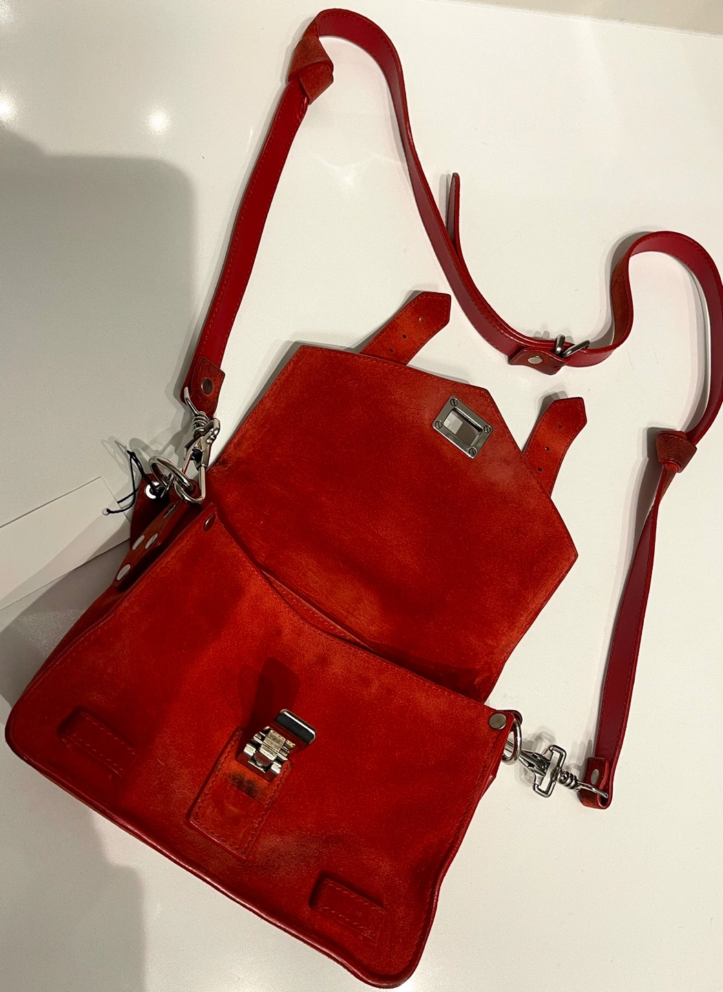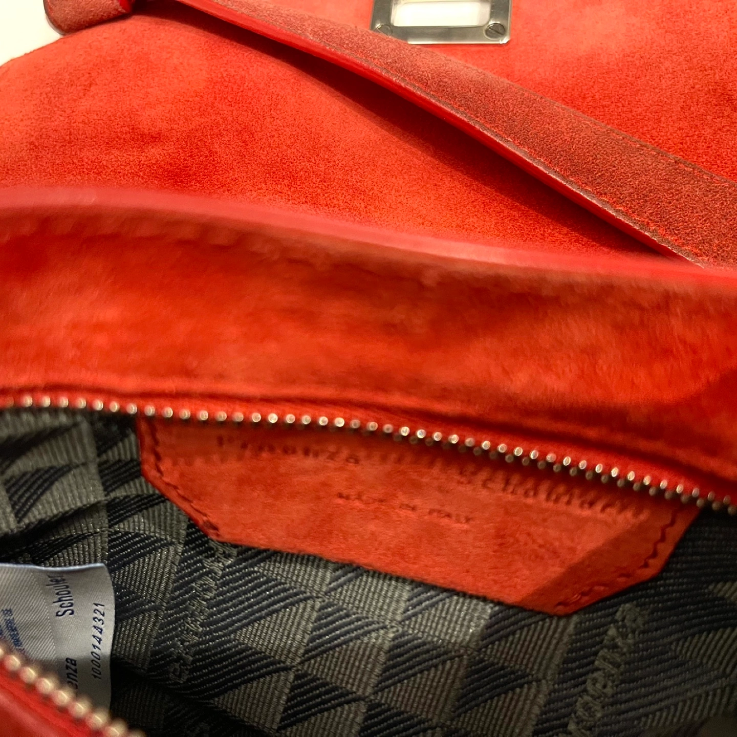 77Red suede leather crossbody bag. Features a flap closure, silver-toned hardware, and adjustable strap. Interior zip pocket. Excellent pre-owned condition. Suede has some dark spots (rubbed off from my darker clothes) and can be cleaned. Interior leather is in great conditions. Very much pre-loved. Selling as I have been wearing more totes lately. Comes from odour-free, pet-free household.