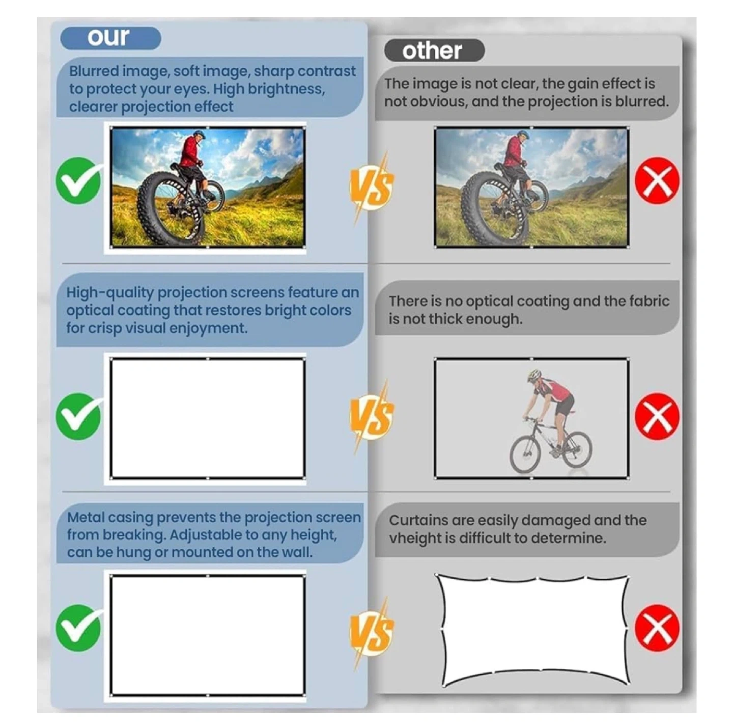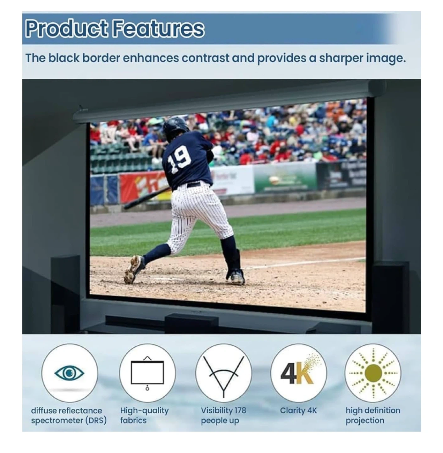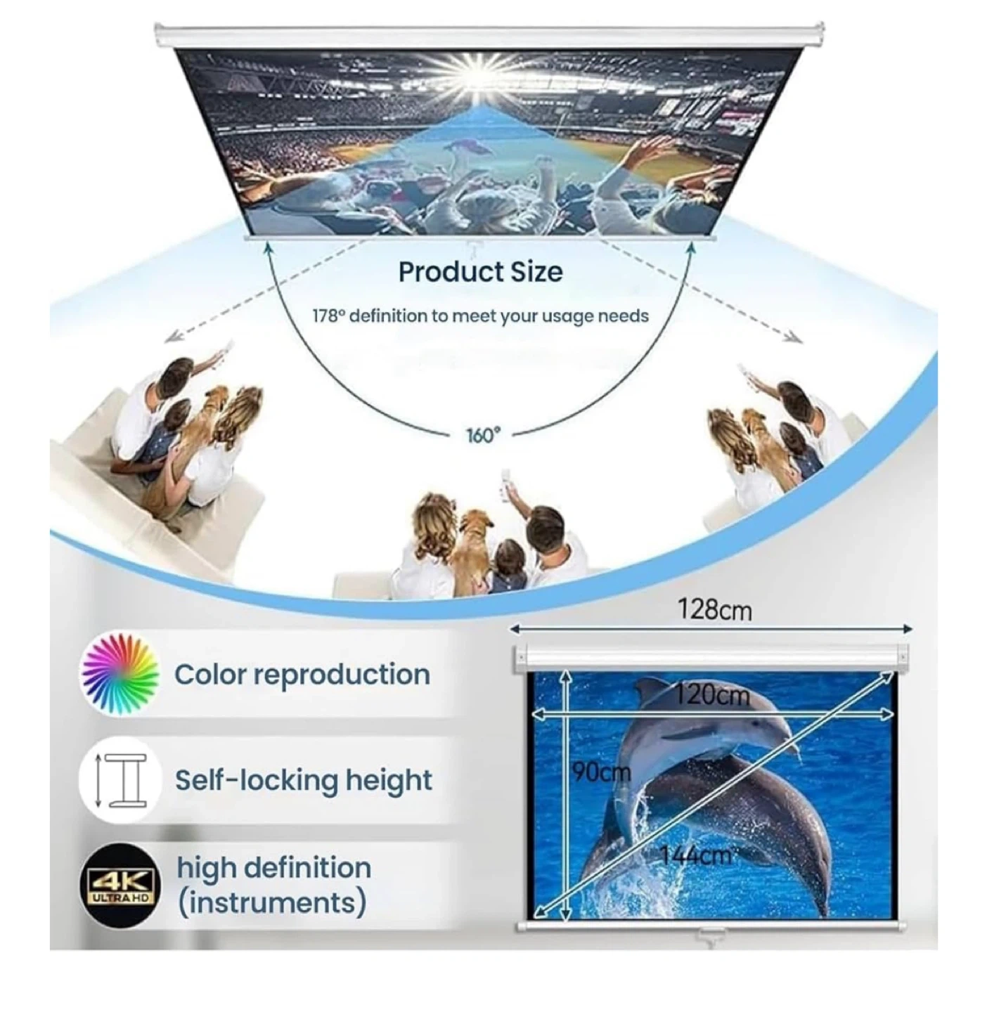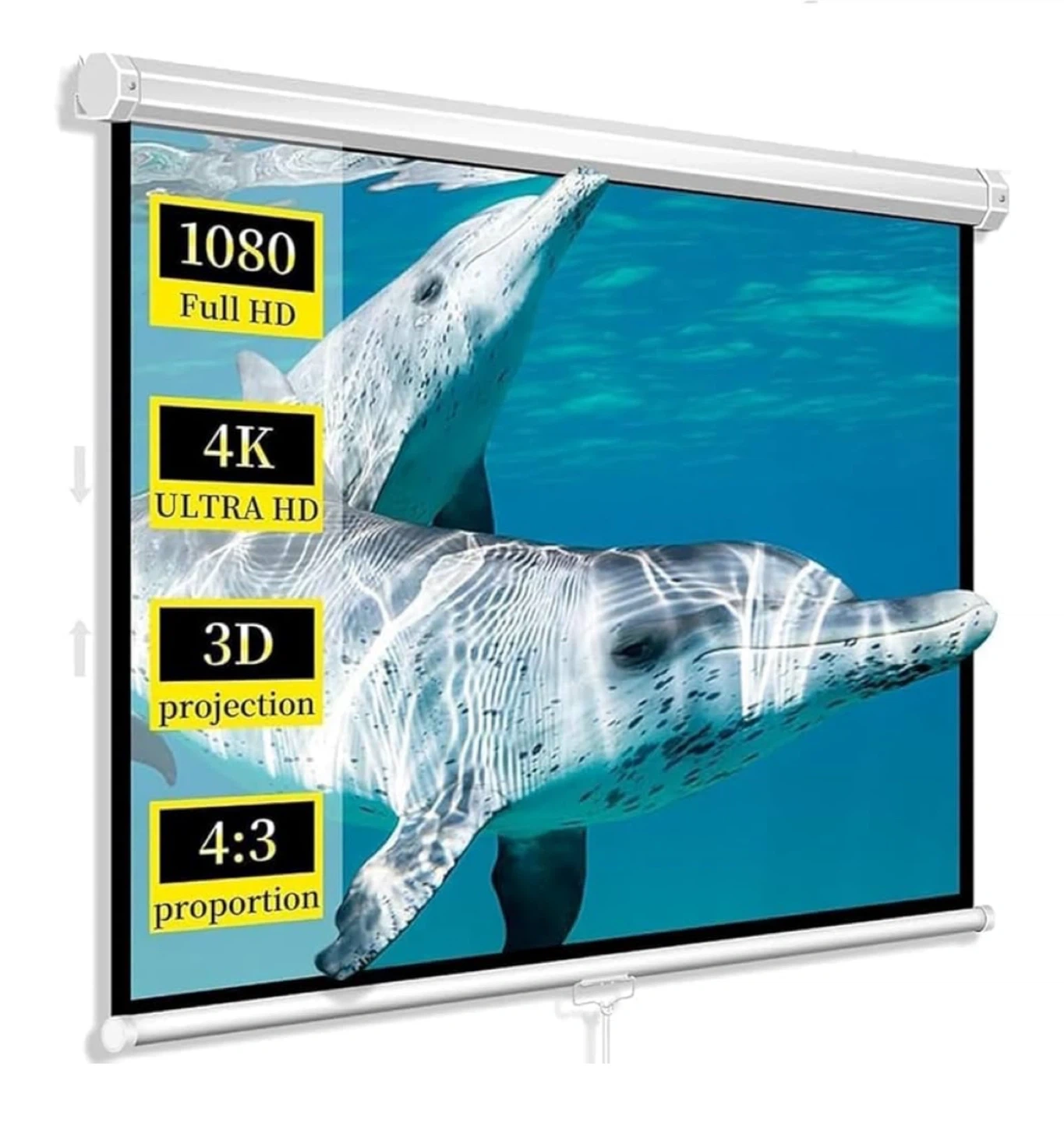 80This projector screen is in great condition and ready to enhance your viewing experience! It supports 1080 Full HD and 4K Ultra HD resolution, ensuring crisp and clear images. The black border enhances contrast, providing a sharper image. It also features high-quality fabrics and an optical coating for crisp visual enjoyment. The metal casing prevents damage and allows for easy wall mounting. Product size is 128cm wide, with the screen area being 120cm x 90cm.