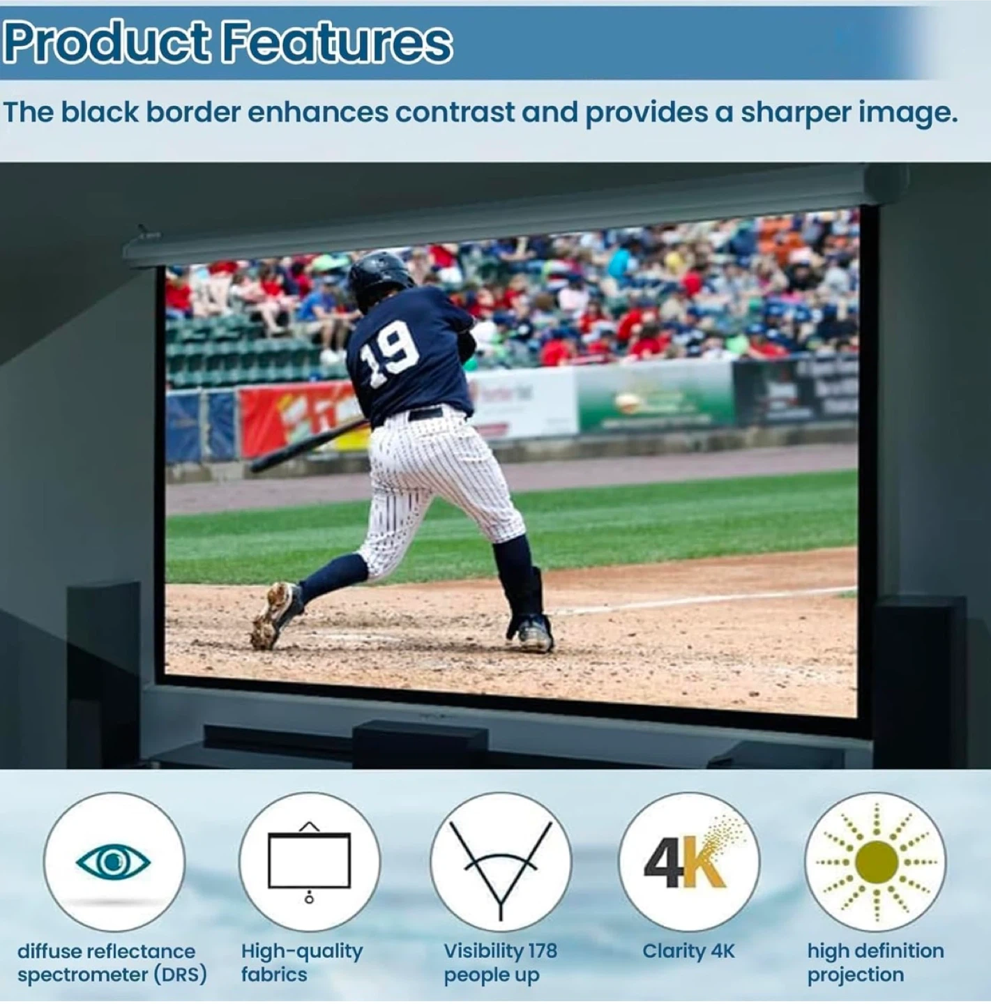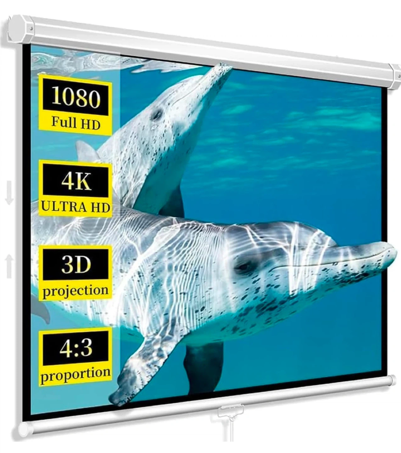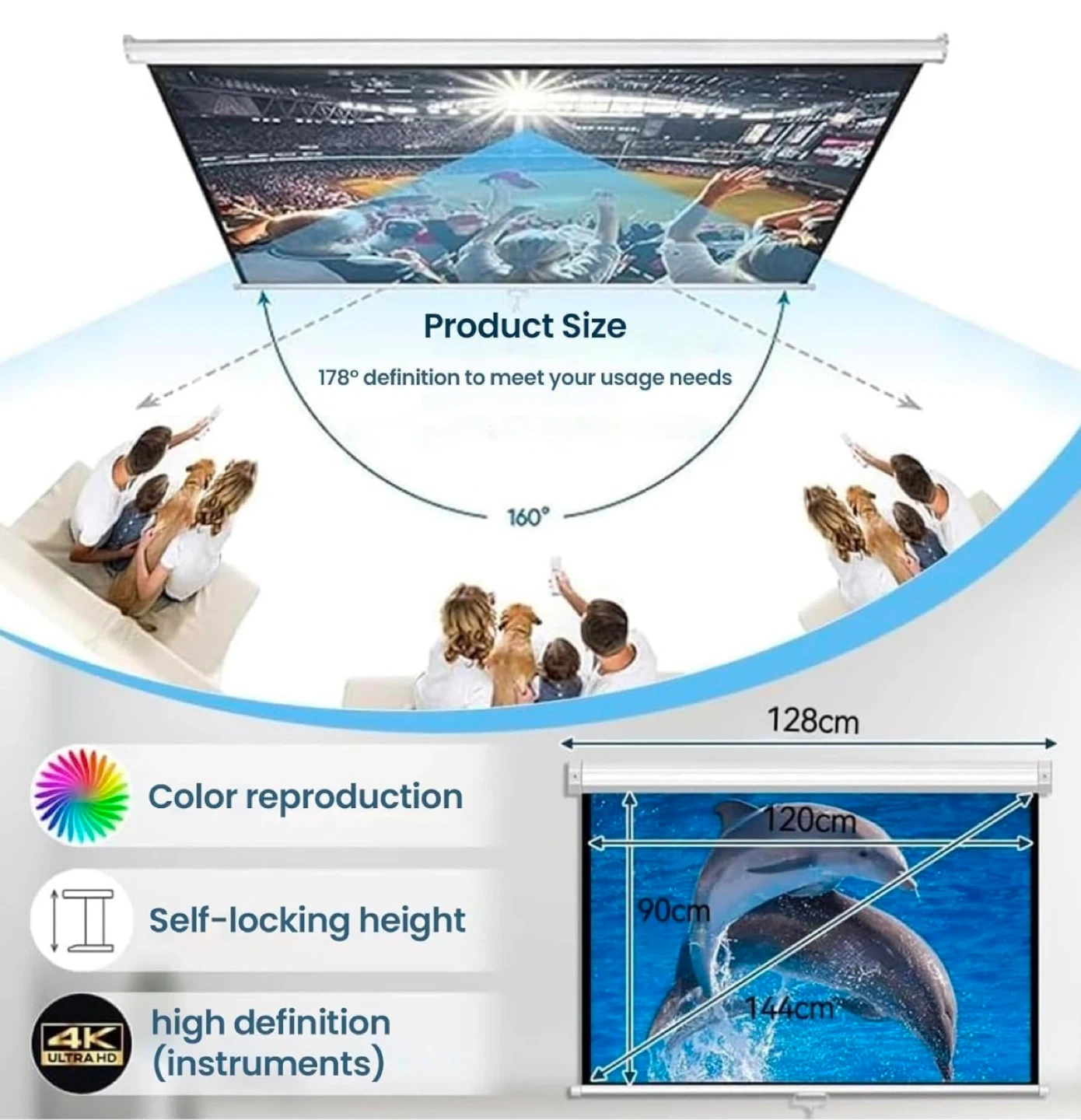 73Selling a projector screen that's perfect for home theatre setups! It features high definition layers, an image-sensitive layer, and a wrinkle-free and waterproof coating. The screen size is 120cm x 90cm, with a 4:3 proportion and supports 4K Ultra HD and 3D projection. It can be wall-mounted or installed on ceilings, and the black border enhances contrast for a sharper image