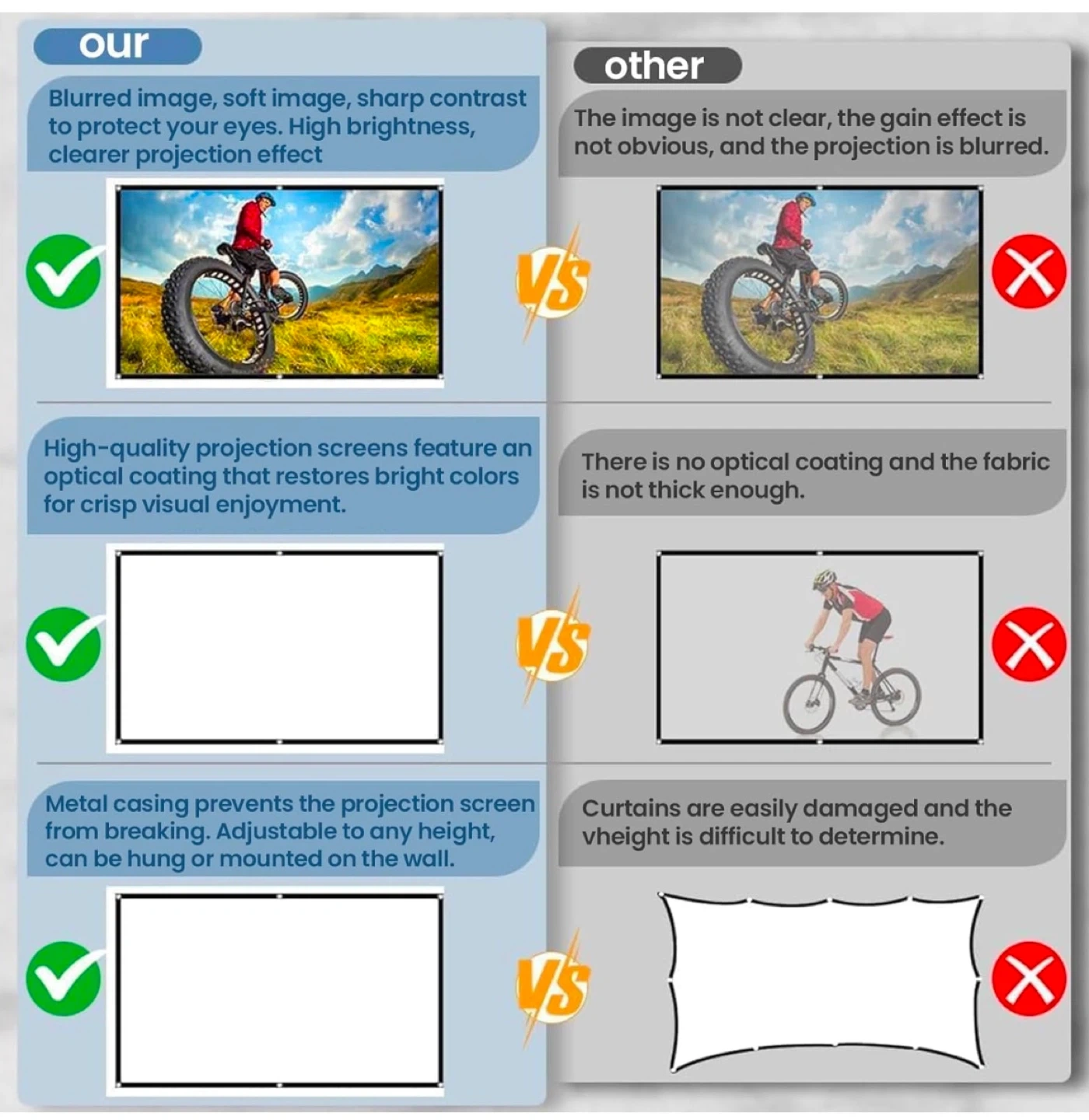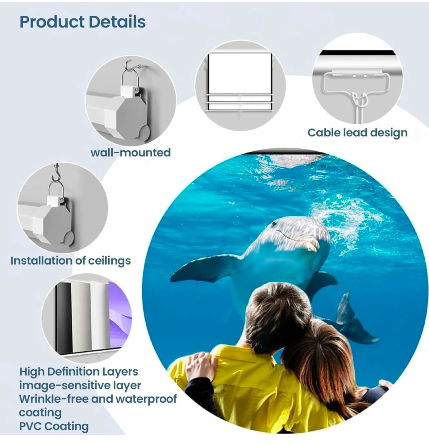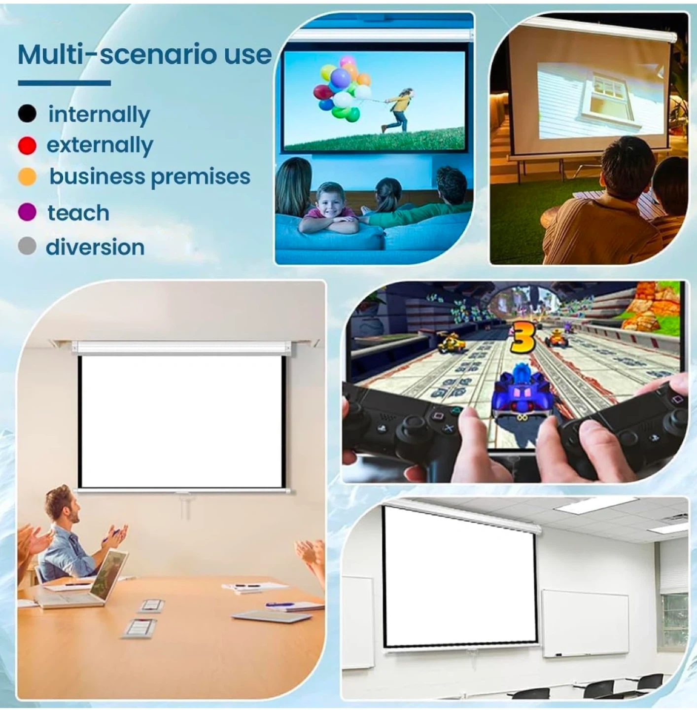 73Selling a projector screen that's perfect for home theatre setups! It features high definition layers, an image-sensitive layer, and a wrinkle-free and waterproof coating. The screen size is 120cm x 90cm, with a 4:3 proportion and supports 4K Ultra HD and 3D projection. It can be wall-mounted or installed on ceilings, and the black border enhances contrast for a sharper image
