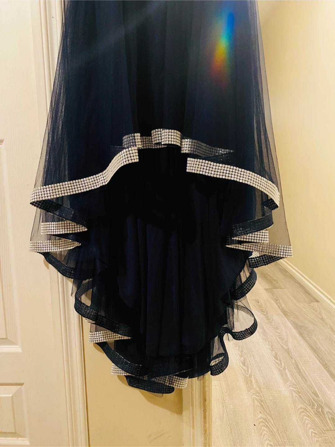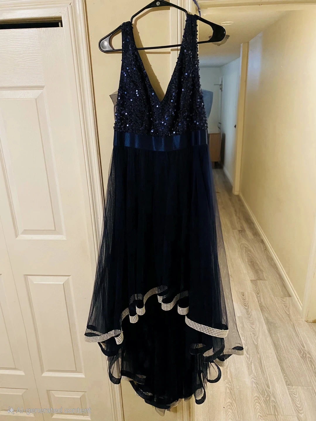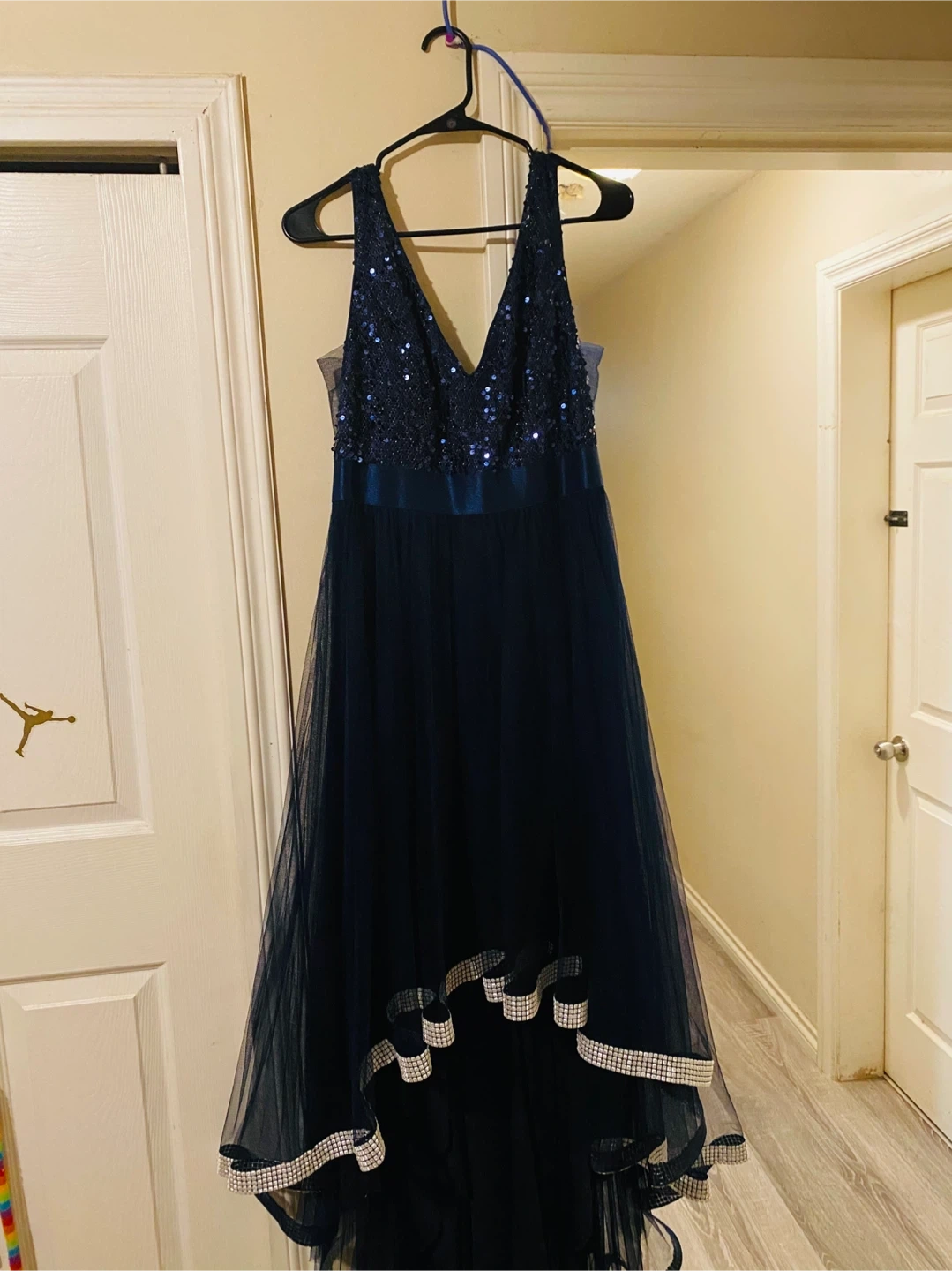 65Selling a beautiful navy blue sequin prom/grad dress in size XL. The dress features a V-neck and a tulle skirt with rhinestone detailing at the hem. The bust measures 40.2 inches and the waist is 31.1 inches. Perfect for prom/grad or any special occasion! Price slightly negotiable…
