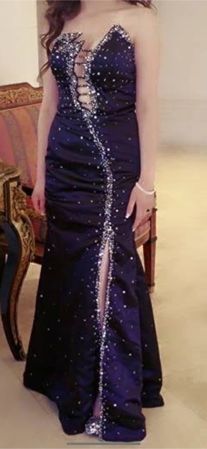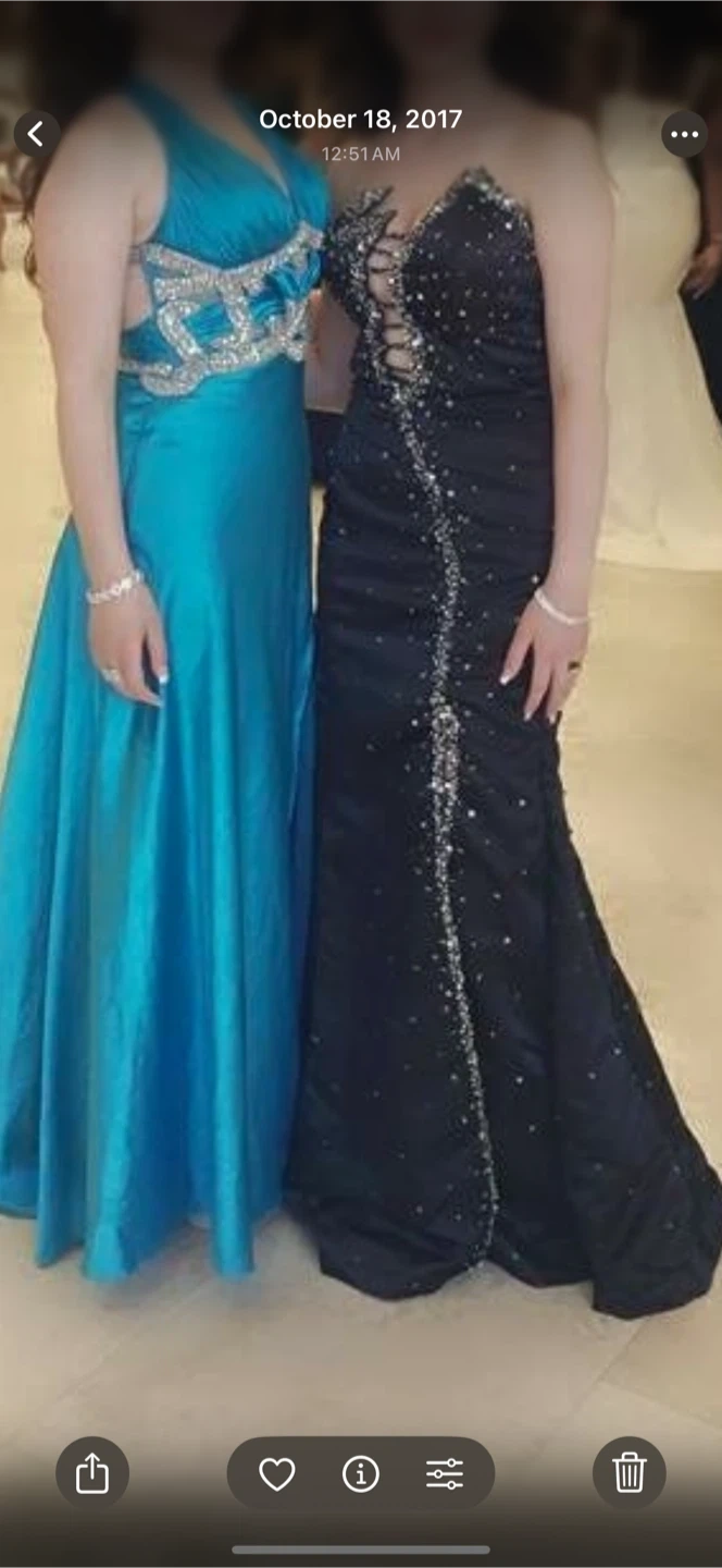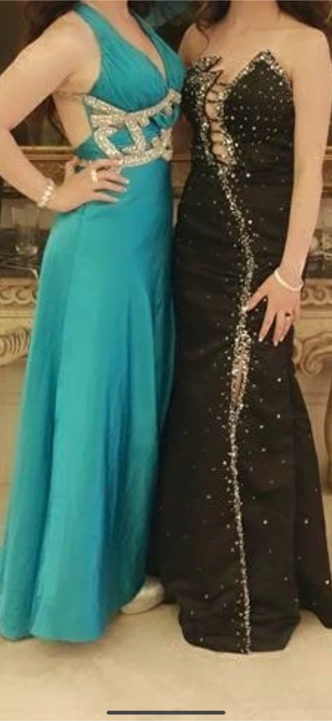 Beautiful prom dress for sale! It's a stunning black gown with silver detailing. Perfect for making a statement at your next special event.