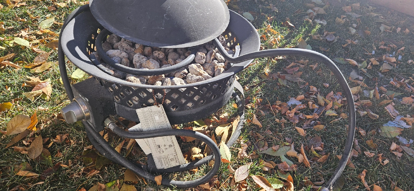 Selling a propane fire pit, perfect for those chilly evenings! It comes with lava rocks to help distribute the heat evenly. It's in good condition and ready to use in your backyard or patio