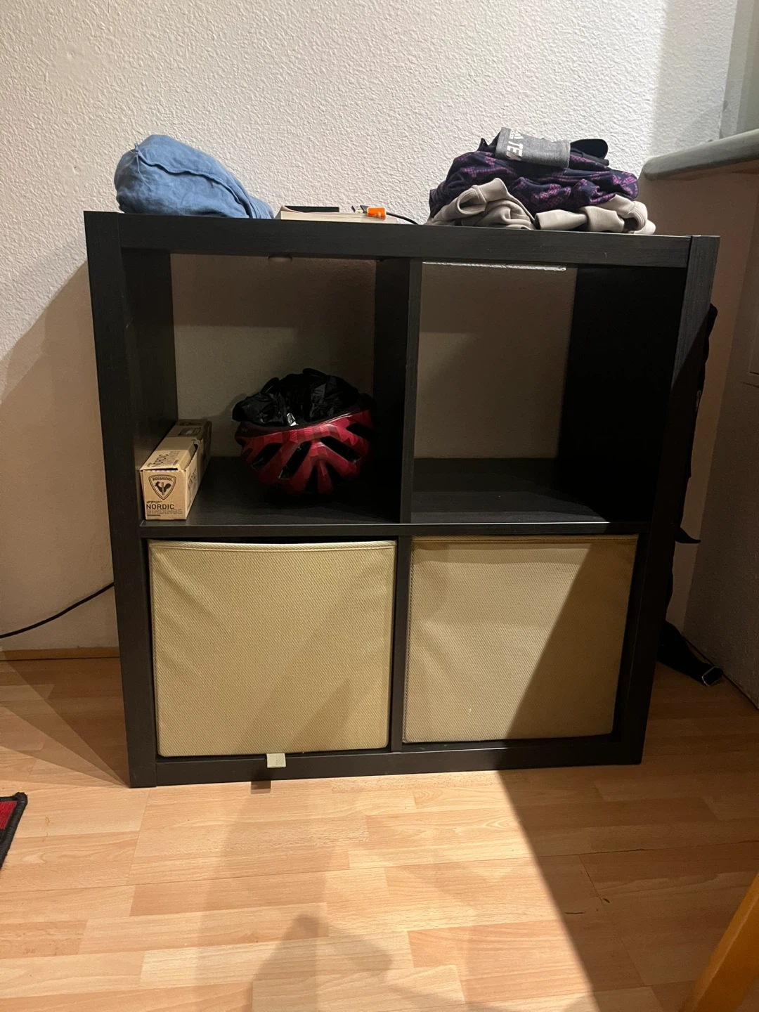 A black IKEA KALLAX shelf unit with two tan storage bins. It's a 2x2 cube configuration. Perfect for organizing items in your living space. Holds books, decor, or small appliances.