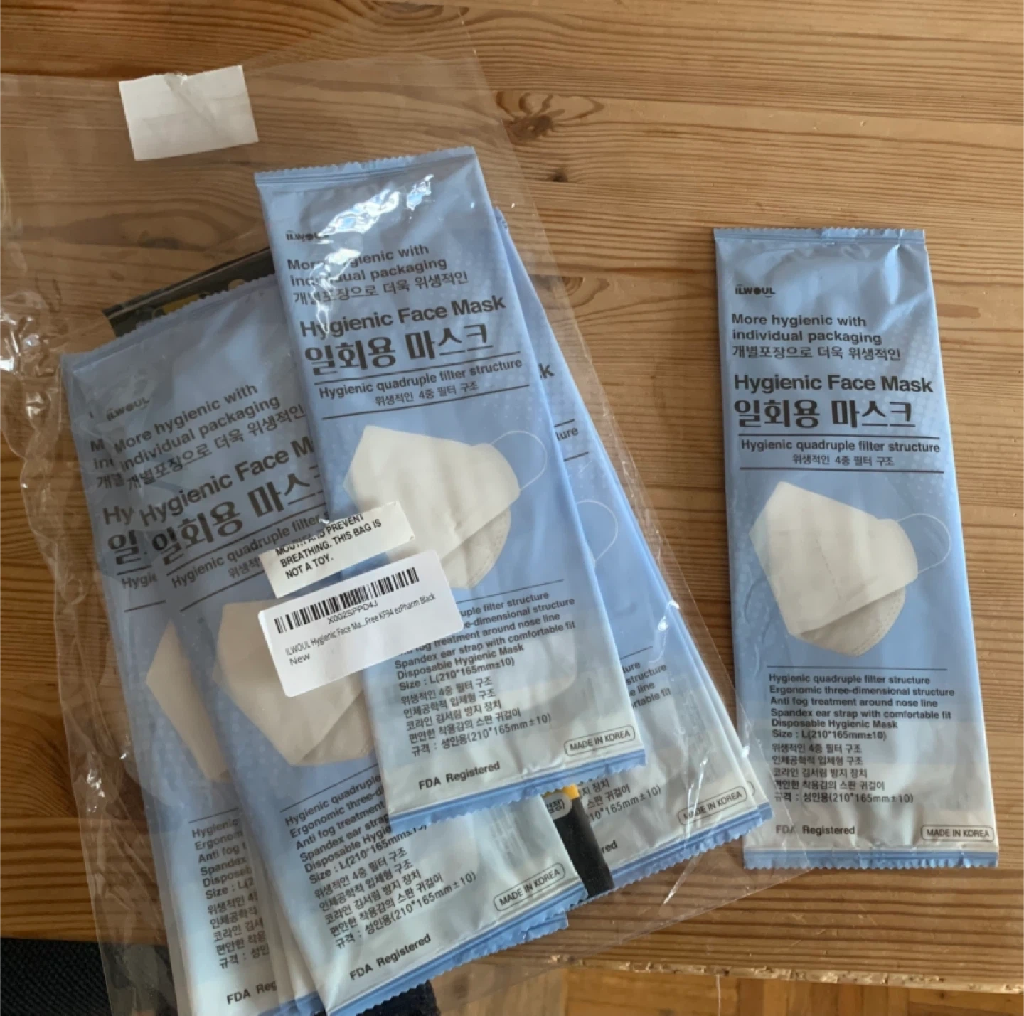 I'm selling some ILWOUL Hygienic Face Masks. These are individually packaged for extra hygiene. They feature a hygienic quadruple filter structure and an ergonomic three-dimensional structure for a comfortable fit. The size is 210*165mm (+10). They're also FDA registered