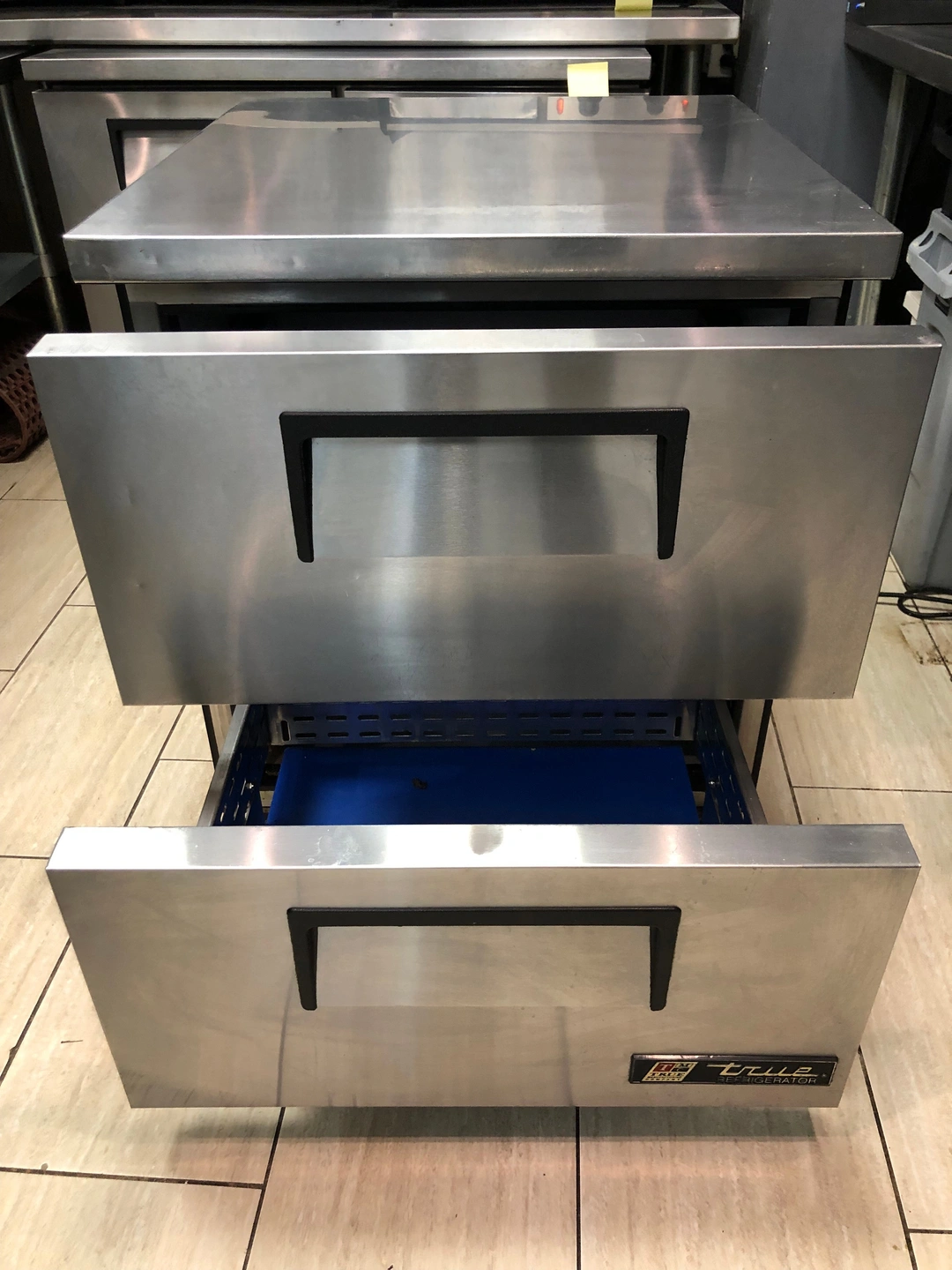 Under counter 28" x 33" 2 Drawer True Refrigerator with Stainless Steel Countertop. Door seal could use replacement