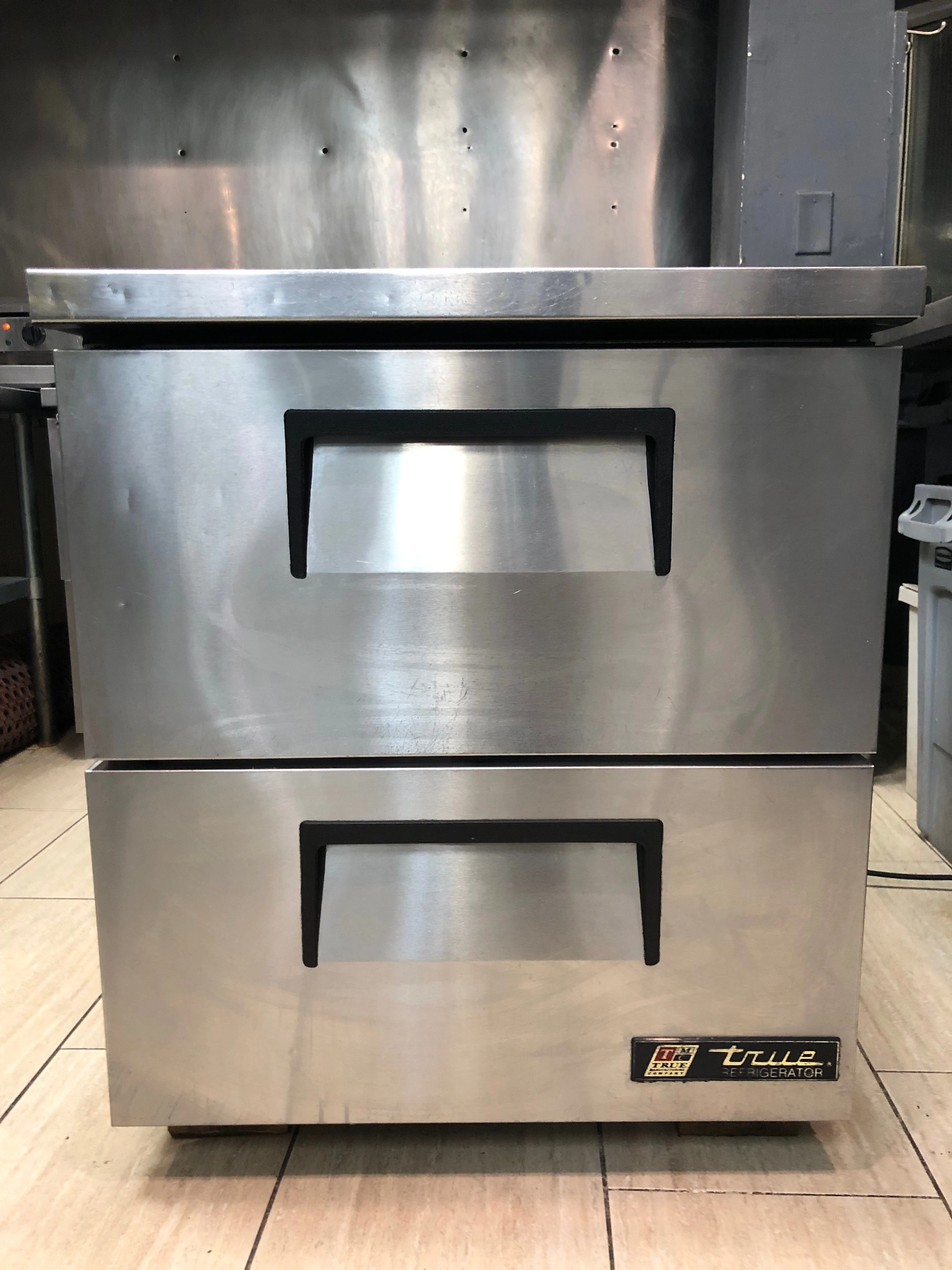 Under counter 28" x 33" 2 Drawer True Refrigerator with Stainless Steel Countertop. Door seal could use replacement