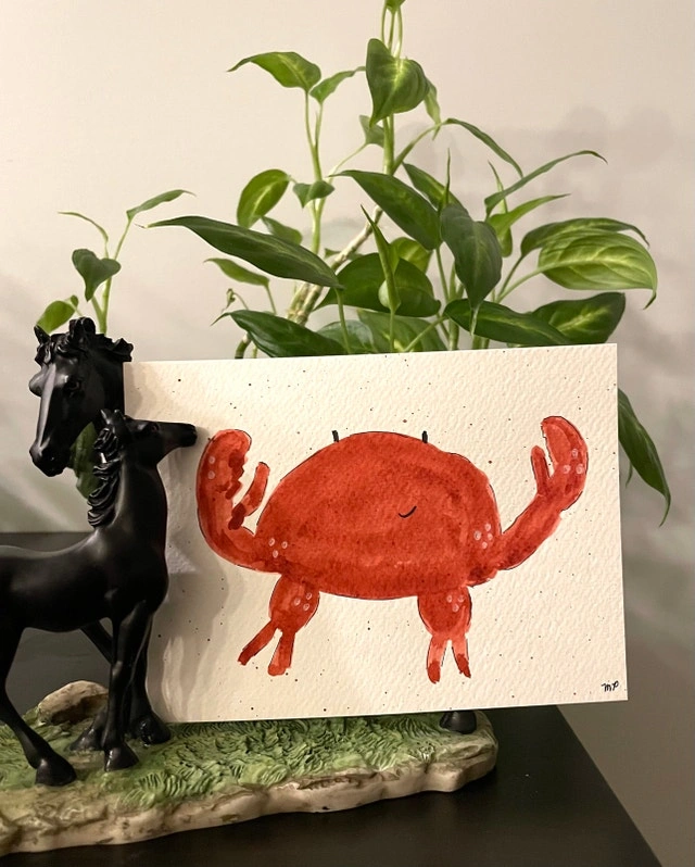 Original 5x7 watercolor painting of a happy crab, by me. This piece can be framed, or used as a greeting card or postcard. It would be a lovely addition to a baby's or kid's room, and also makes a great gift. Buy 5 (5x7) paintings and get one free. Please see my other paintings.