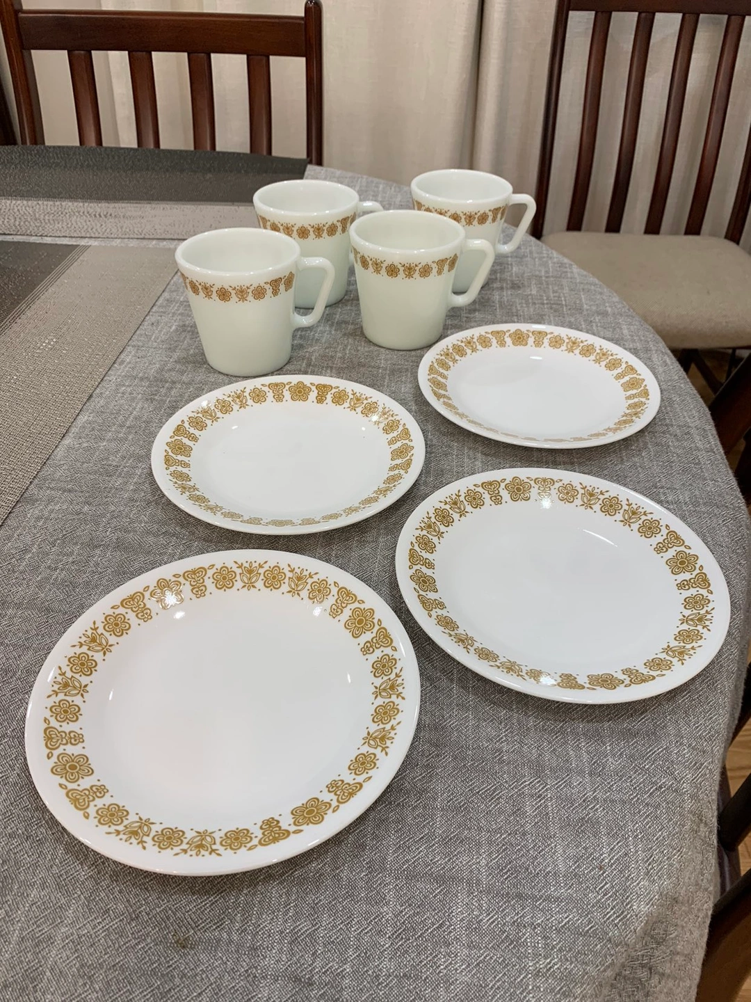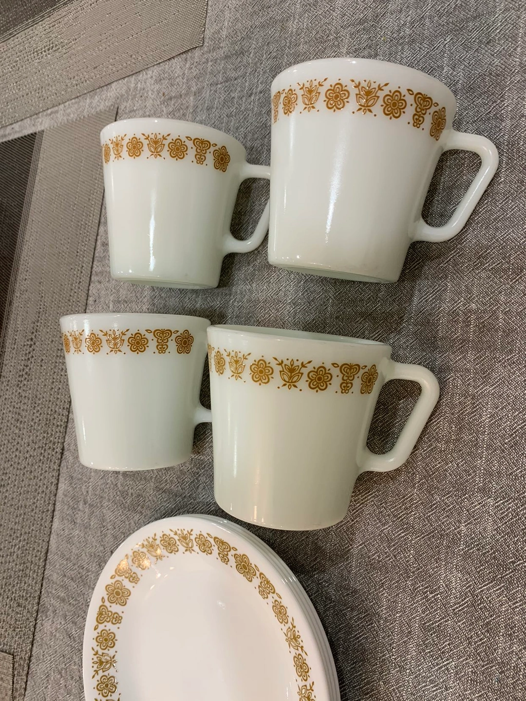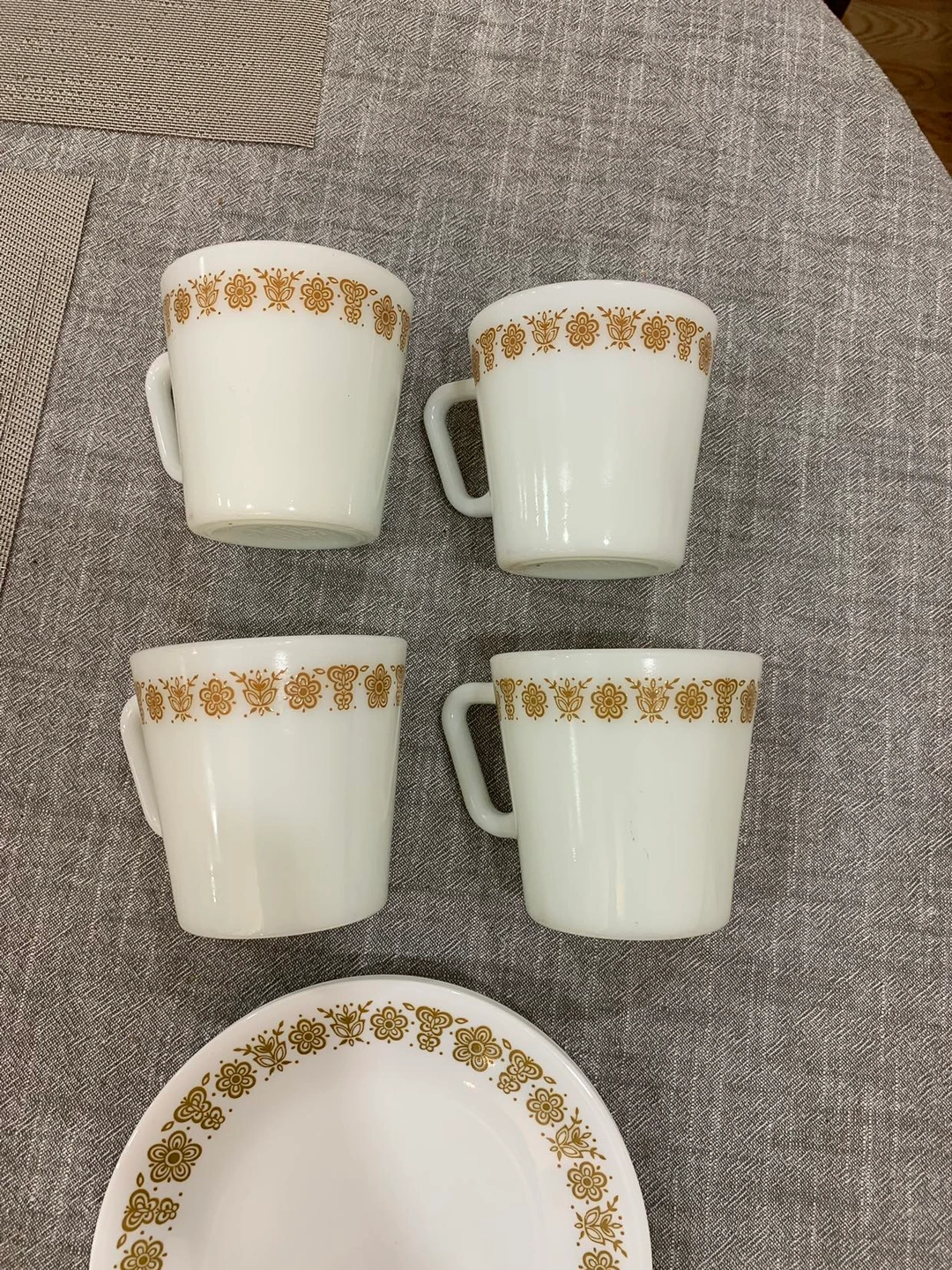 4 Pyrex Gold Butterfly Mugs & Small Plates