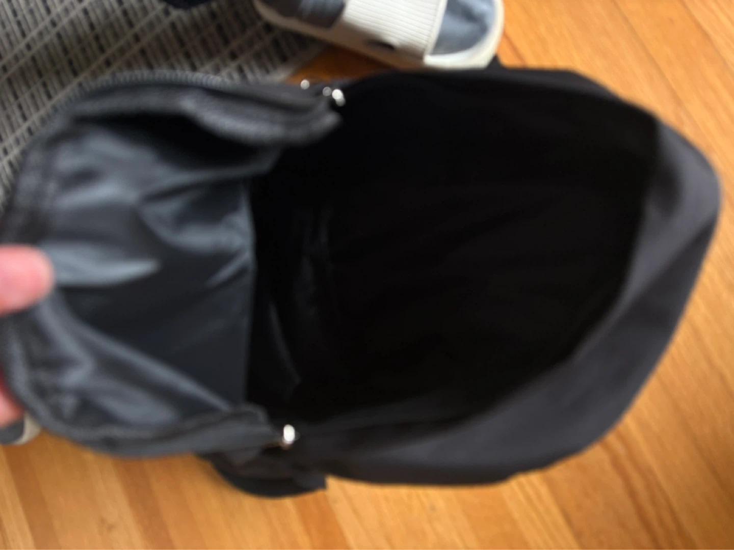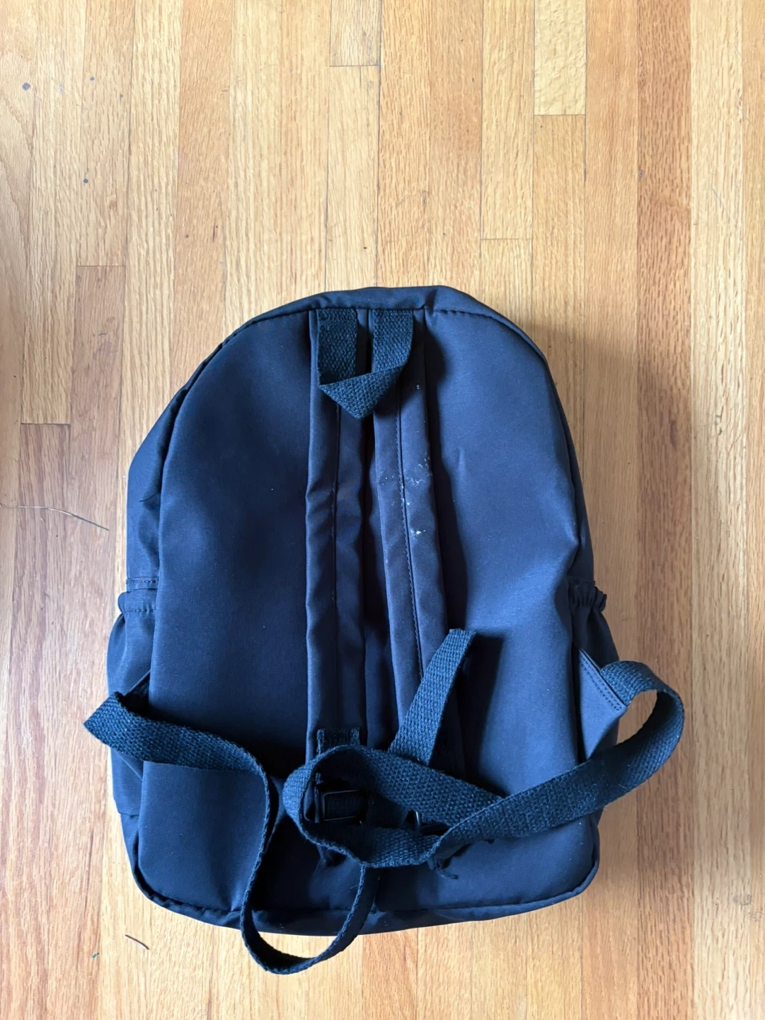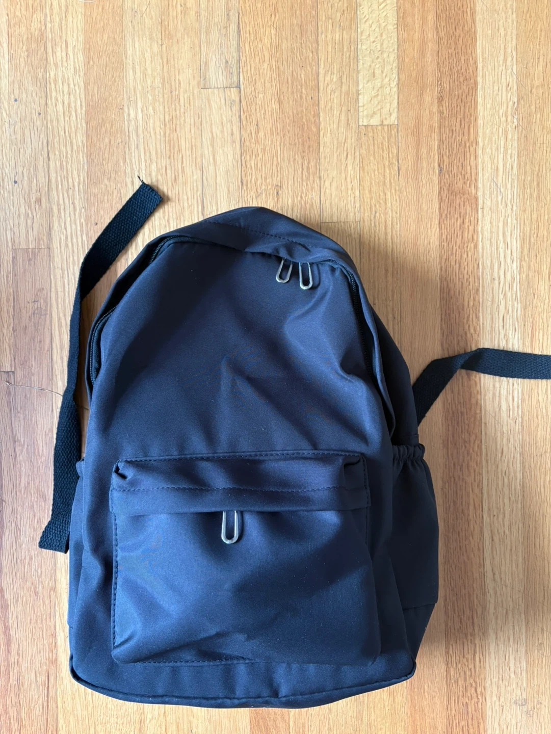 This is a black backpack with a front pocket and two side pockets. It's made of a durable fabric. This backpack's main compartment zips open to reveal a spacious interior. It's suitable for carrying everyday essentials.