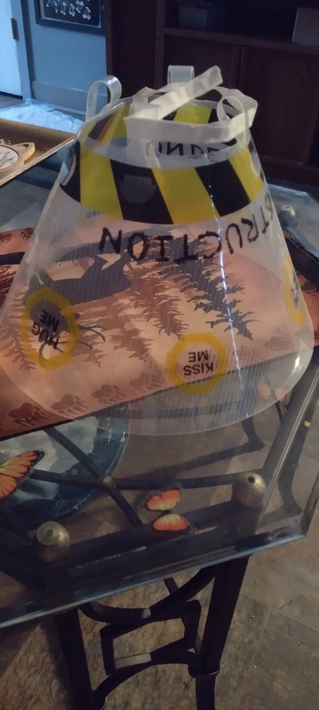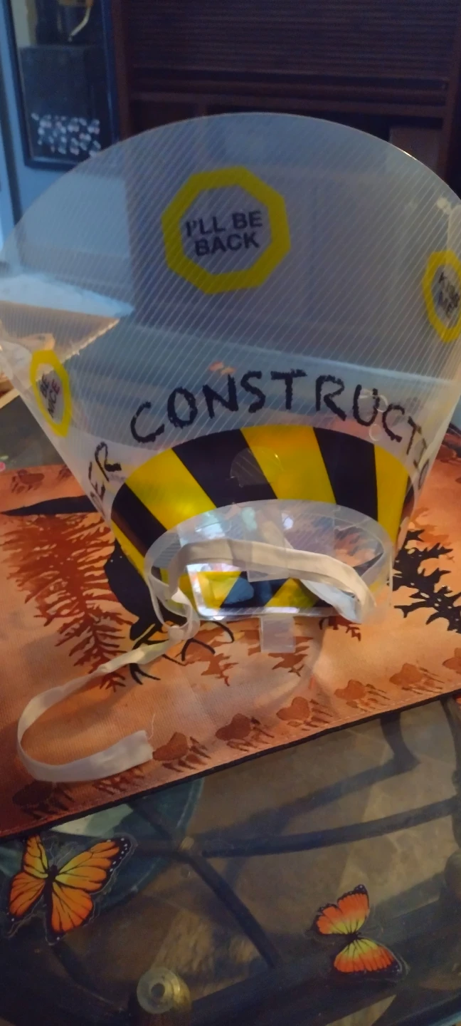 This is a clear plastic pet recovery cone with a fun construction theme printed on it! It has phrases like 'Under Construction', 'I'll Be Back', and 'Hug Me'. It's designed to prevent pets from aggravating a surgical site or wound. Adjustable tie closure.