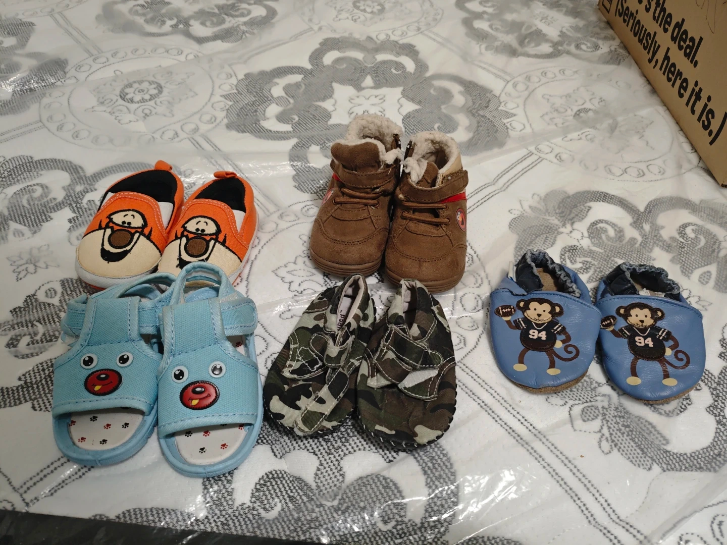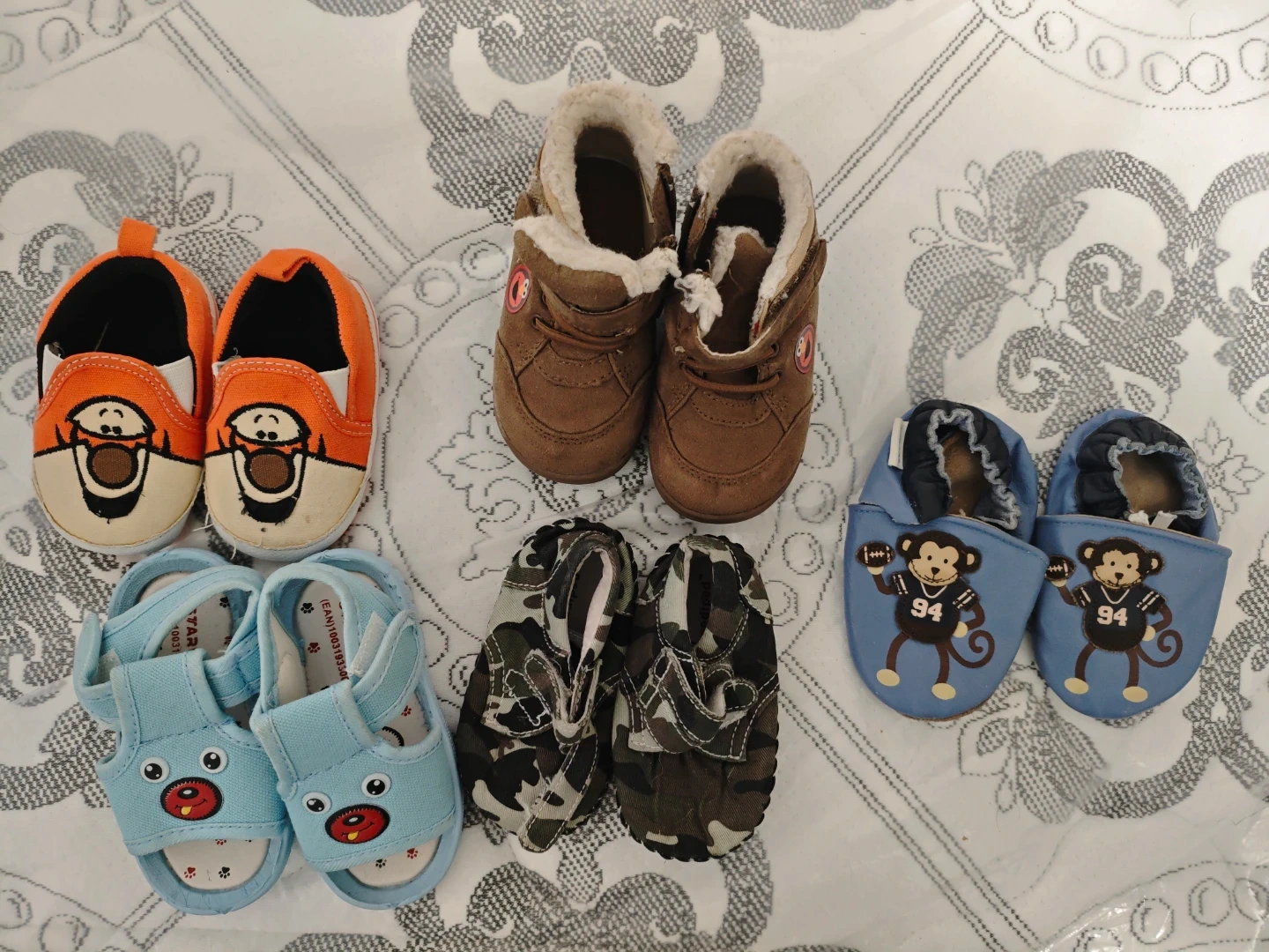 Here's a bundle of 5 pairs of cute baby shoes. It includes orange character shoes, blue monkey sandals, camouflage slip-ons, and brown fur-lined boots. Great for keeping little feet comfy and stylish!