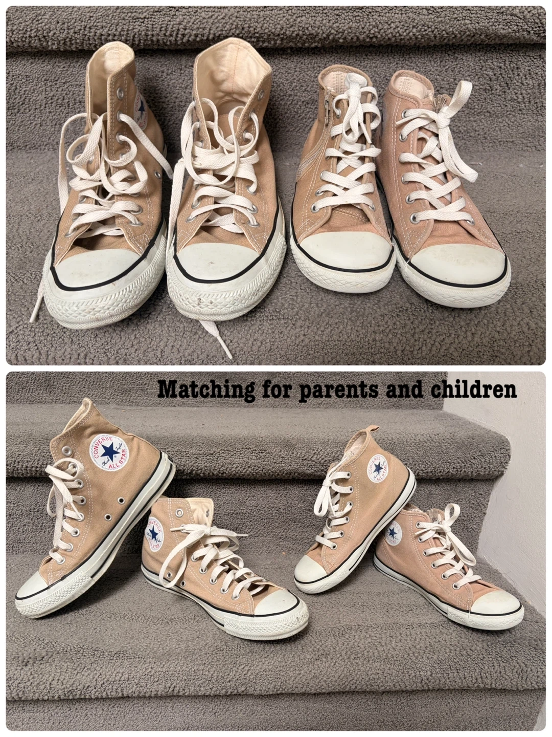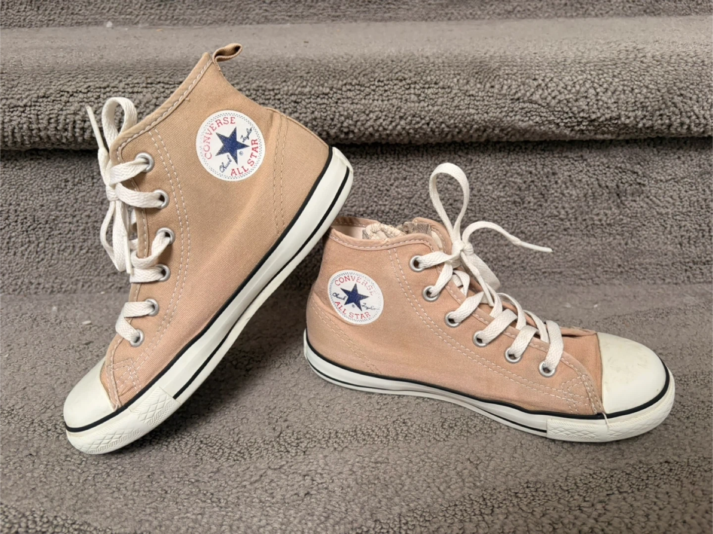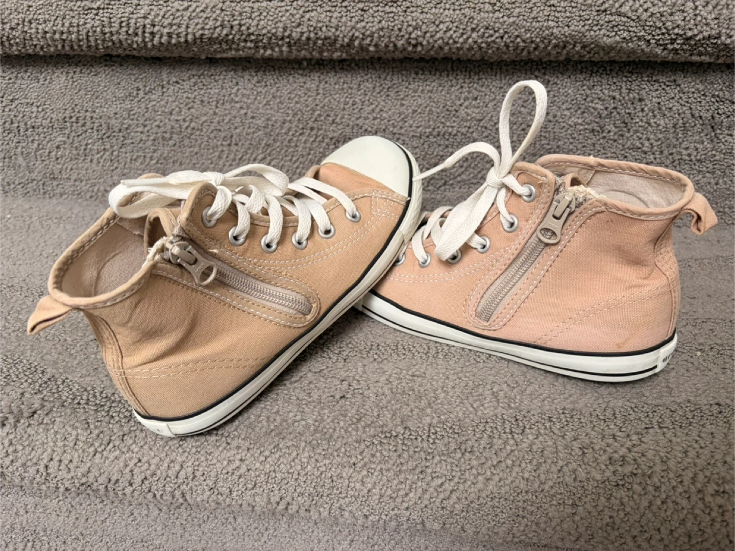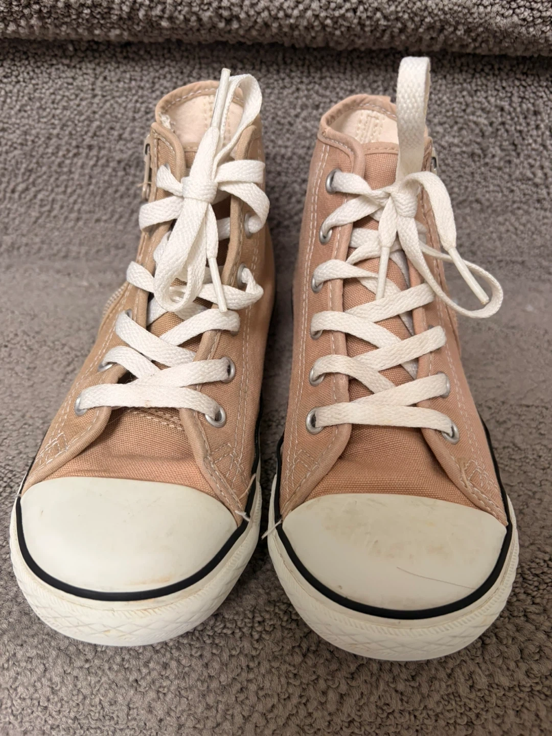 Get ready to step out in style with these gently Converse All Star high-tops for kids, size 1. These cute sneakers are in good condition and feature a convenient zipper on the side for easy on and off. The neutral colour will pair perfectly with any outfit! Bought in Tokyo & possible to match with parents in trendy!