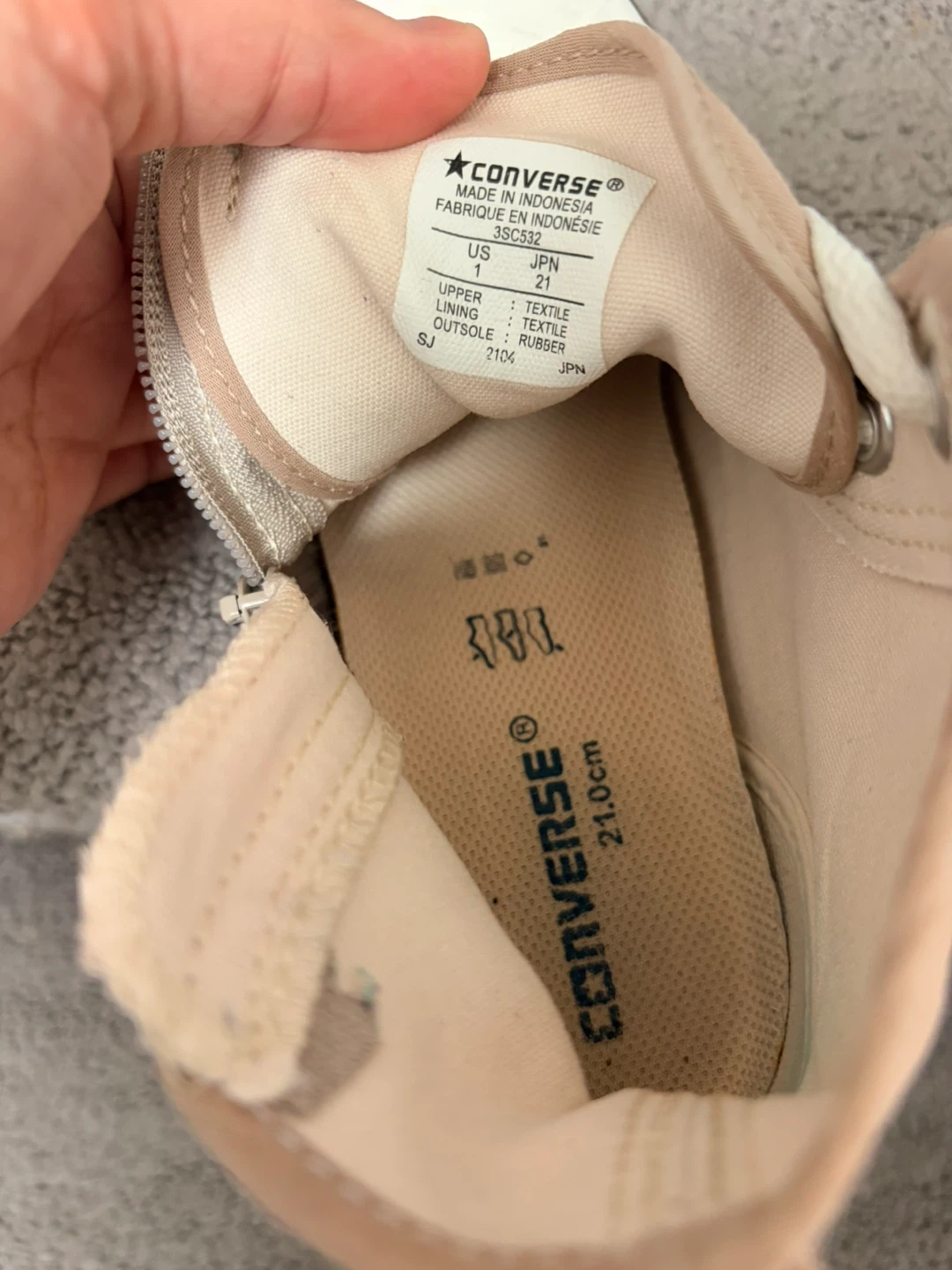 Get ready to step out in style with these gently Converse All Star high-tops for kids, size 1. These cute sneakers are in good condition and feature a convenient zipper on the side for easy on and off. The neutral colour will pair perfectly with any outfit! Bought in Tokyo & possible to match with parents in trendy!