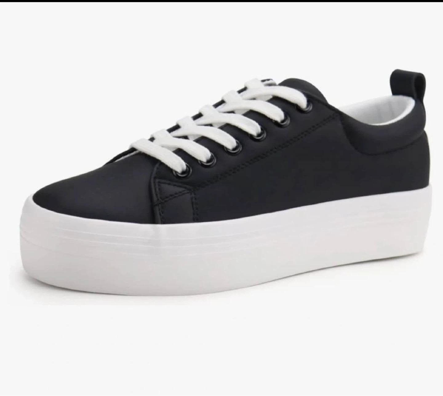 Classic black lace-up platform sneakers with a thick white sole. These shoes offer a comfortable and stylish look. Synthetic upper and rubber sole.