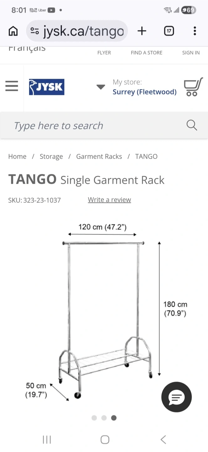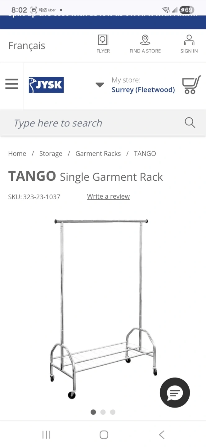 Buy & SellJYSK TANGO Single Garment RackJYSK TANGO Single Garment Rack$75Chrome single garment rack. Steel frame material. Weight capacity of 50 kg. Assembly is required. Pick up Near Fraser&59th aveConditionLike newWHERE TO MEETCheck LocationView MapSELLERverifiedVicaSunset1538 reviews0 chats·0 favorites·2 viewsSEND CHAT TO SELLERHi Vica! I’m interested in your listing.Hi Vica! I’m interested in your listing.Get the Karrot app to chatSign In to chat