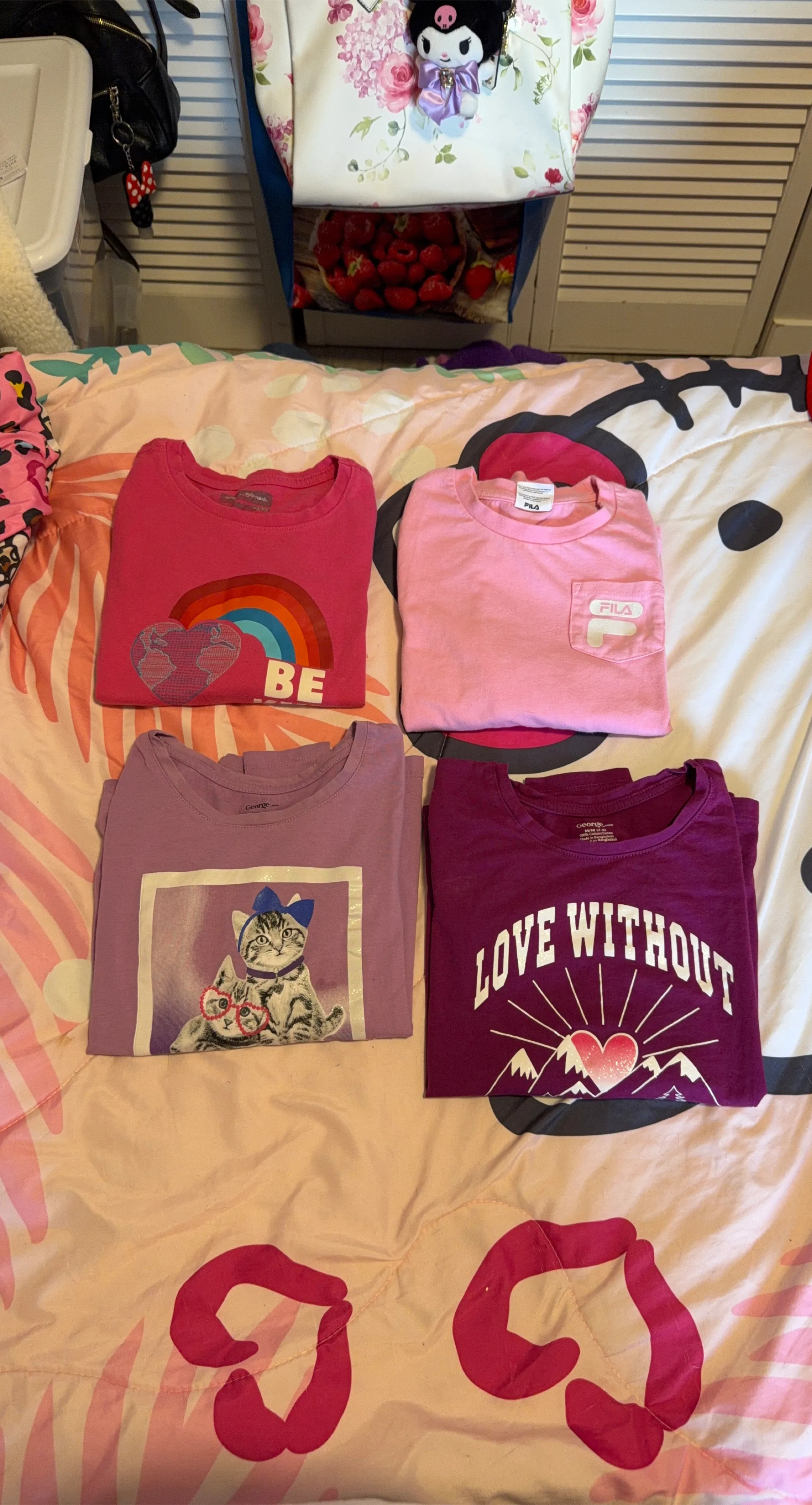 A bundle of four girls' t-shirts featuring various graphic designs and colours. Includes a pink shirt with a rainbow and heart, a light pink Fila t-shirt, a lavender shirt with cats, and a purple shirt with mountains and the phrase 'Love Without'. All shirts are made of comfortable fabric.