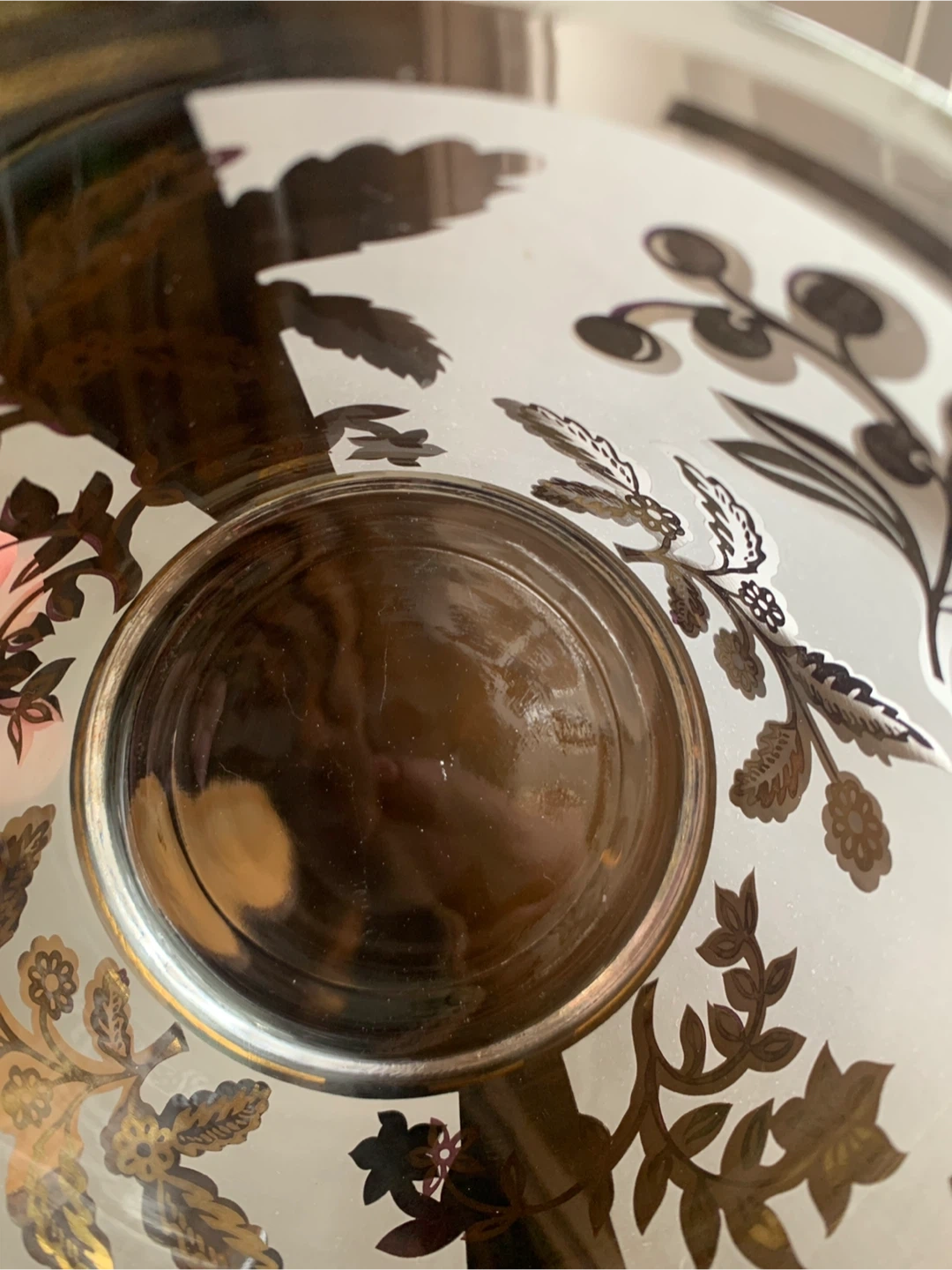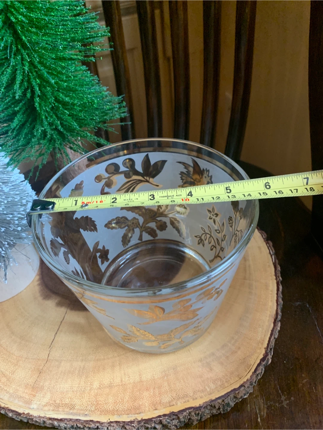 This is a stunning piece of 1960 history! It features a frosted glass and a beautiful gold-tone floral, berry and bird design around it. It has a wide rim with a gold band at the top. This ice bucket is in near perfect condition and you can faintly see where the cursive L has been worn off on the bottom. Perfect for adding a touch of vintage charm to your glassware collection and would look amazing on a bar cart or shelf!
