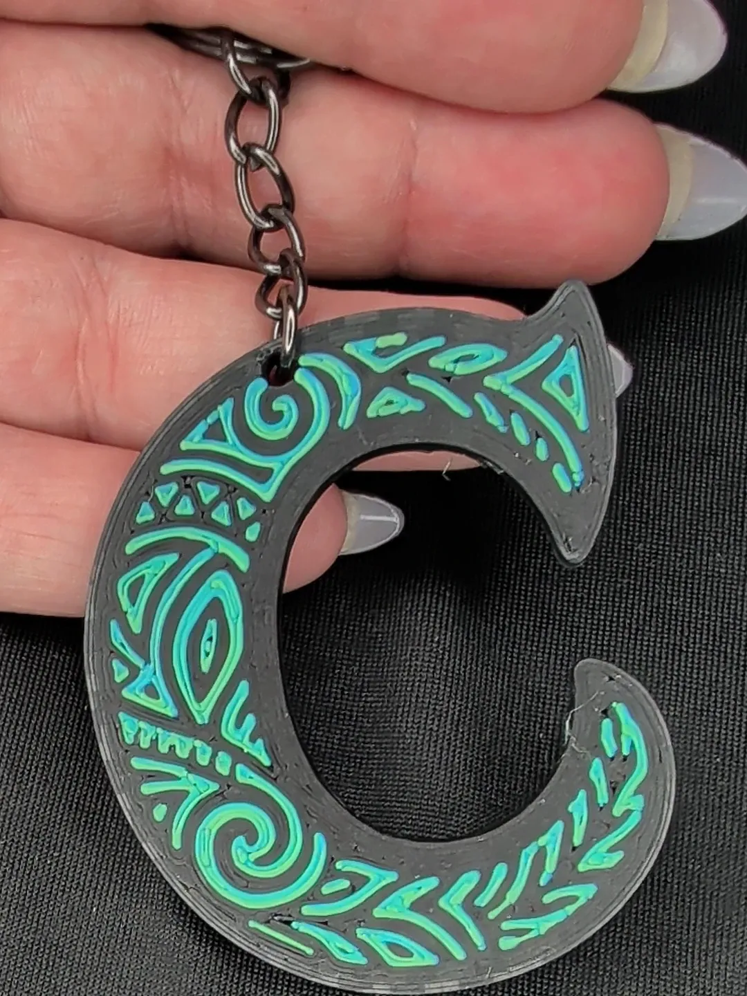 This keychain features the letter 'C' with a black and teal tribal-inspired design. It's attached to a metal keyring and chain. A fun accessory for your keys!