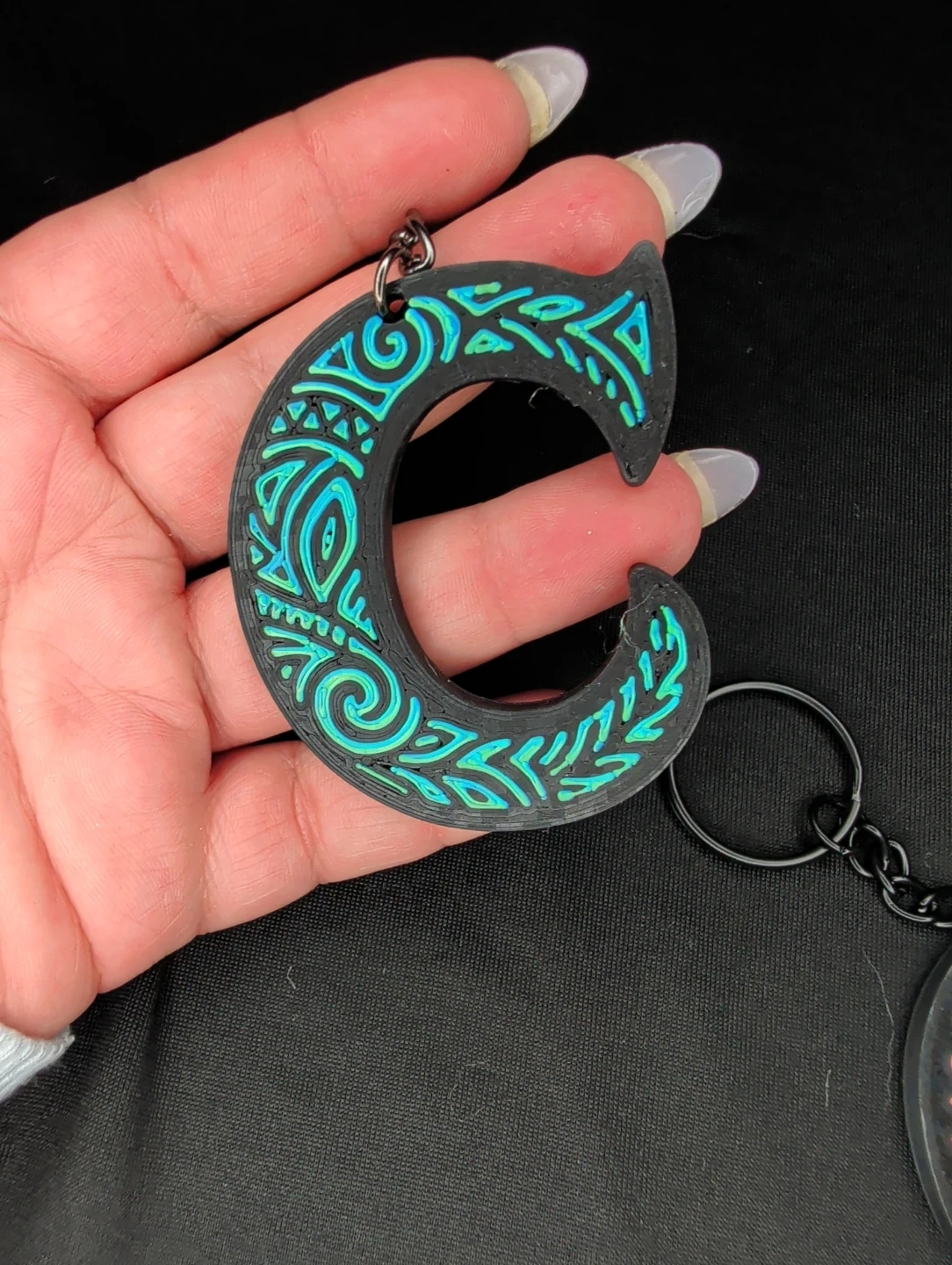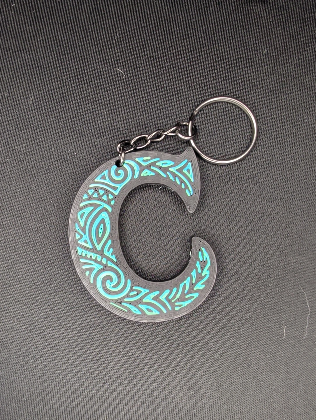 This keychain features the letter 'C' with a black and teal tribal-inspired design. It's attached to a metal keyring and chain. A fun accessory for your keys!