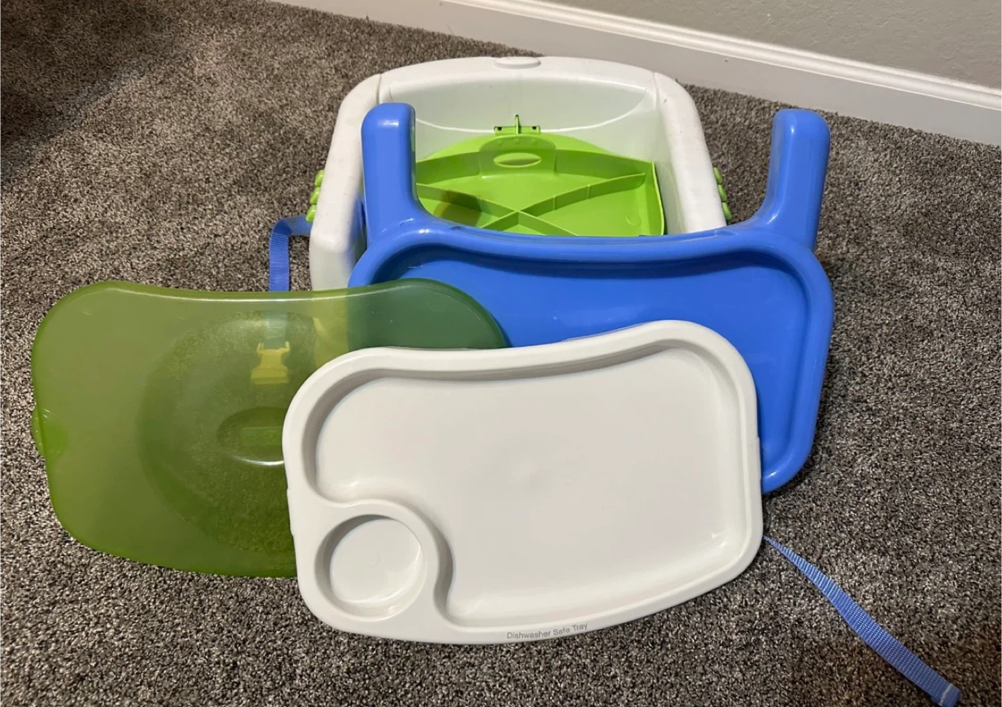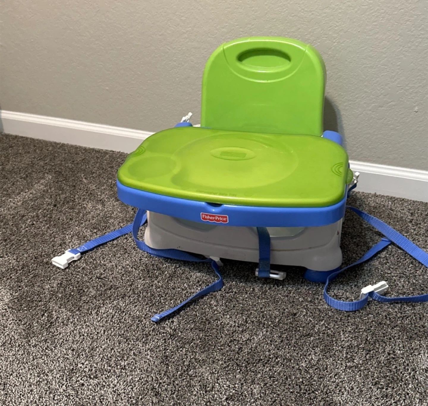 This Fisher-Price booster seat is great for mealtimes. It's easy to clean, and the tray is dishwasher safe. Straps are included for securing it to a chair.