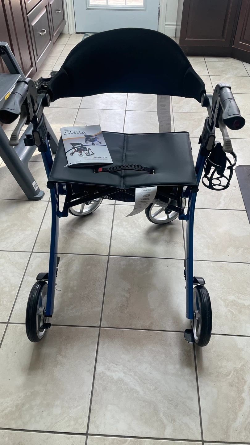 This Stella rollator walker is blue and features a comfortable seat with a storage bag. It also includes a cup holder and adjustable handlebars. Weighs 14lb, Never has been used before!