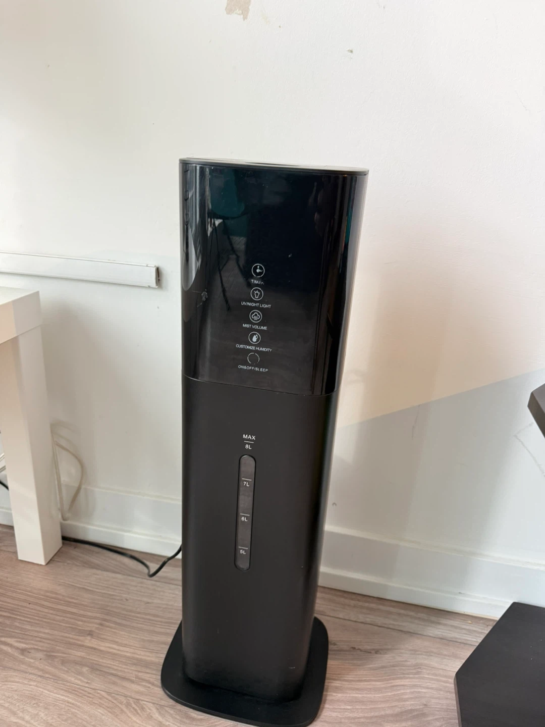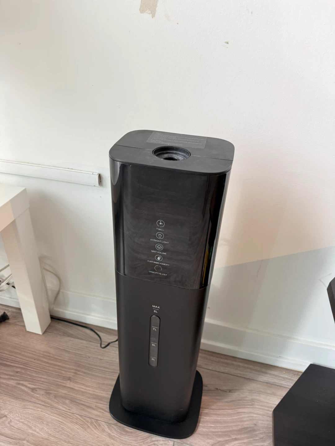 I'm selling a black ultrasonic humidifier. It features touch controls for timer, lighting, mist volume, and custom humidity. It also has an on/off sleep mode. The water tank has a max capacity of 8L