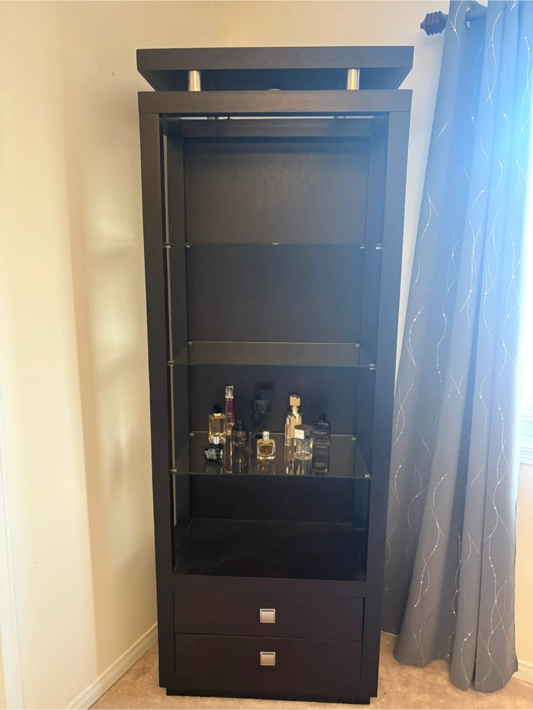 Buy & SellDark Wood Display Cabinet with Glass Shelves and DrawersDark Wood Display Cabinet with Glass Shelves and Drawers$36Dark wood display cabinet featuring three glass shelves and two bottom drawers.ConditionGoodWHERE TO MEETCheck LocationView MapSELLERRitaAudley100 reviews3 chats·0 favorites·40 viewsSEND CHAT TO SELLERHi Rita! I’m interested in your listing.Hi Rita! I’m interested in your listing.Get the Karrot app to chatSign In to chat