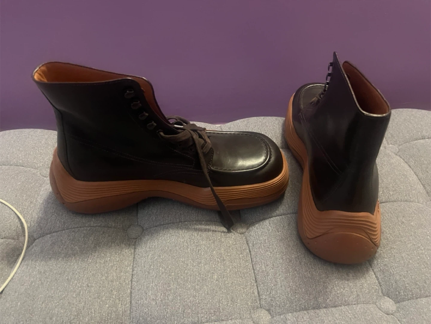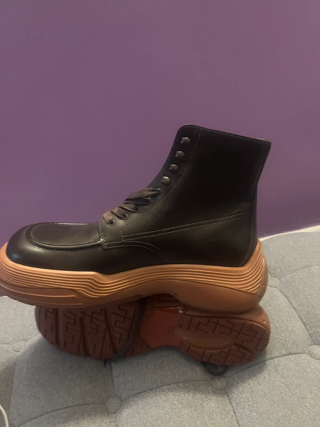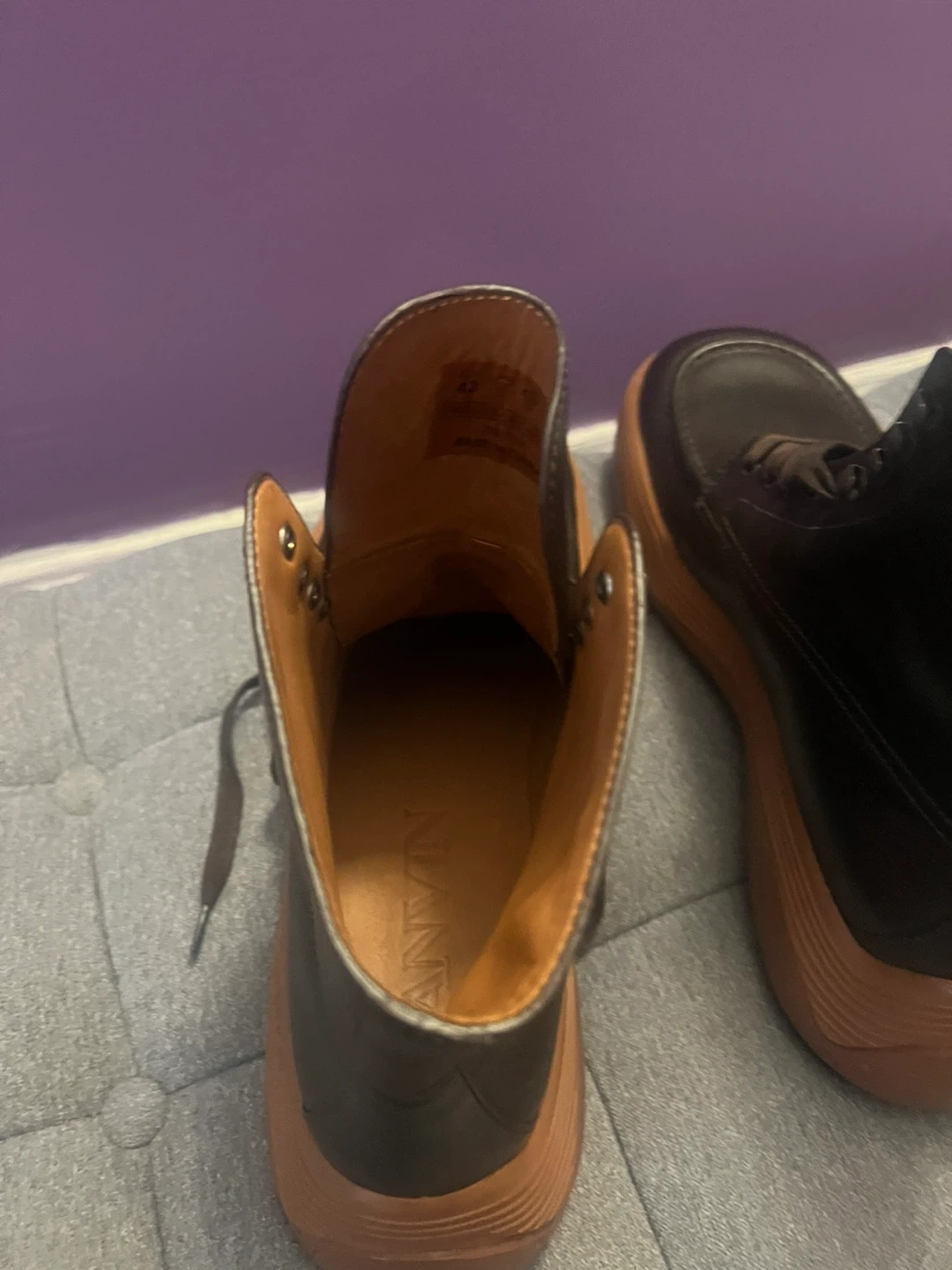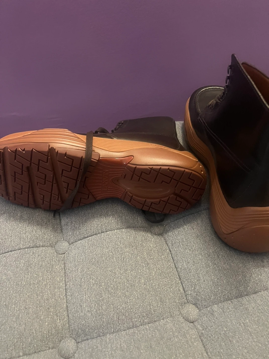 These Lanvin boots feature a rich brown leather upper and a distinctive tan sole. They're designed with a lace-up front and a comfortable high-top silhouette. These boots are made for stylish wear.