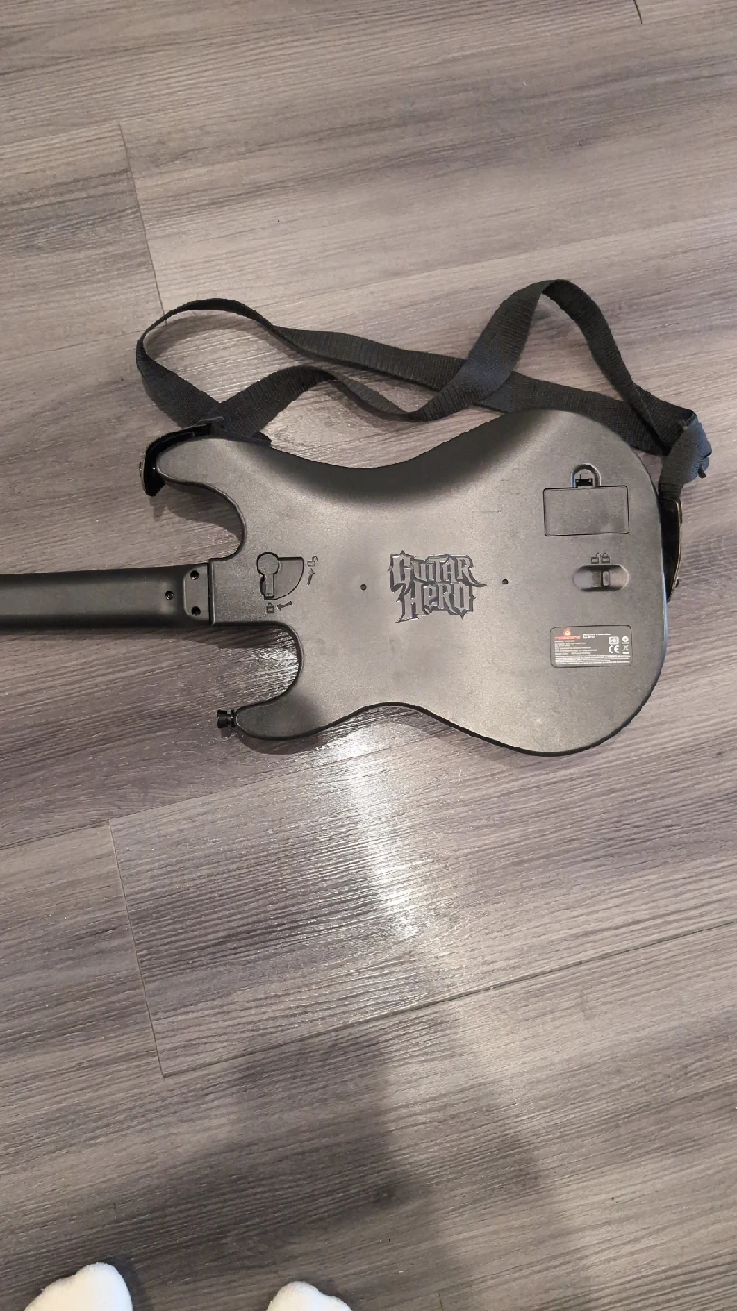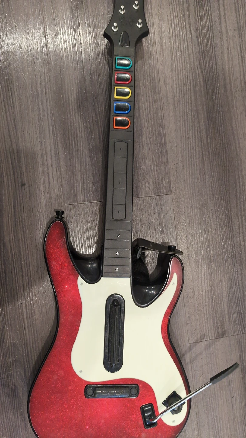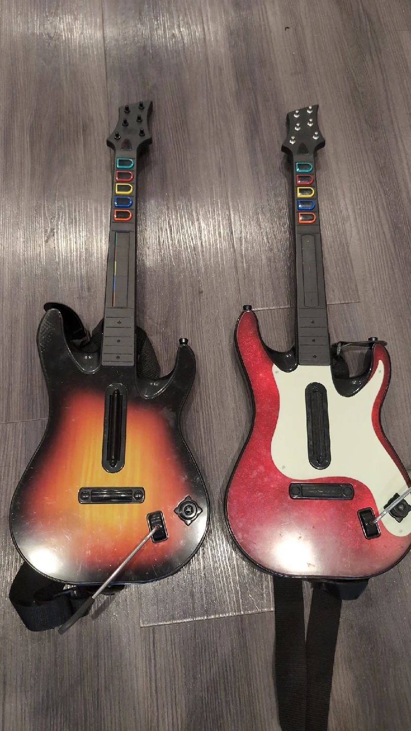 97Selling two Guitar Hero guitar controllers! One is black and orange, and the other is red and white. One comes with shoulder straps.