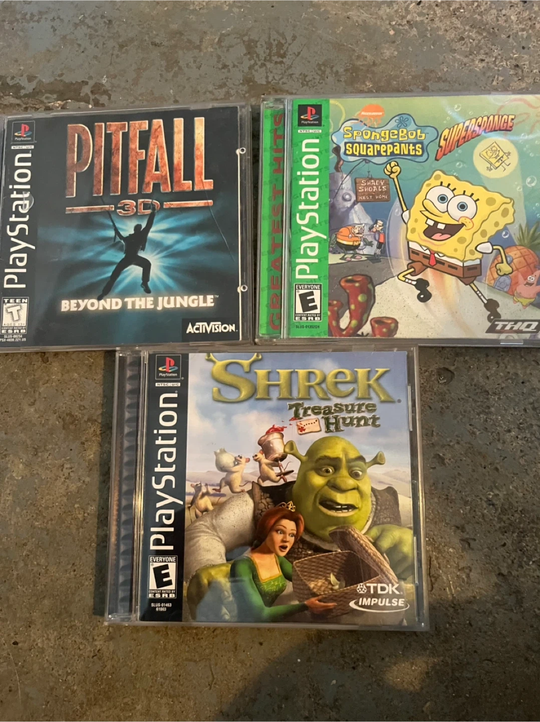 Classic PlayStation 1 games, all discs in good condition. Games: Pitfall 3D: Beyond the Jungle SpongeBob SquarePants: Supersponge Shrek: Treasure Hunt Price: $15 each or $35 for all three