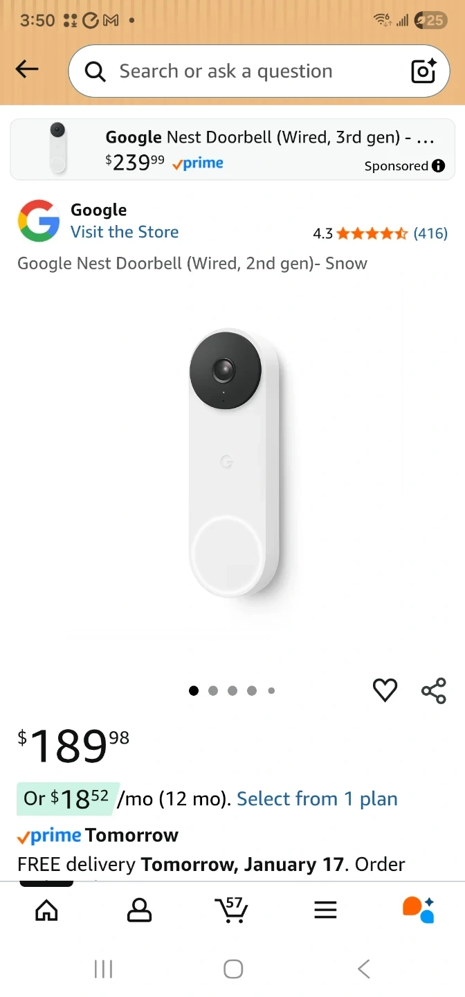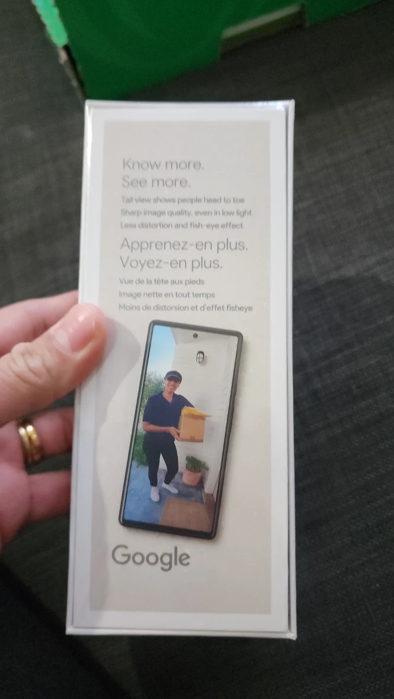This is the Google Nest Doorbell, wired 2nd generation. It offers a tall view and sharp image quality, even in low light. The doorbell has a fish-eye effect for a wider perspective. It's useful for seeing who's at your door from head to toe.