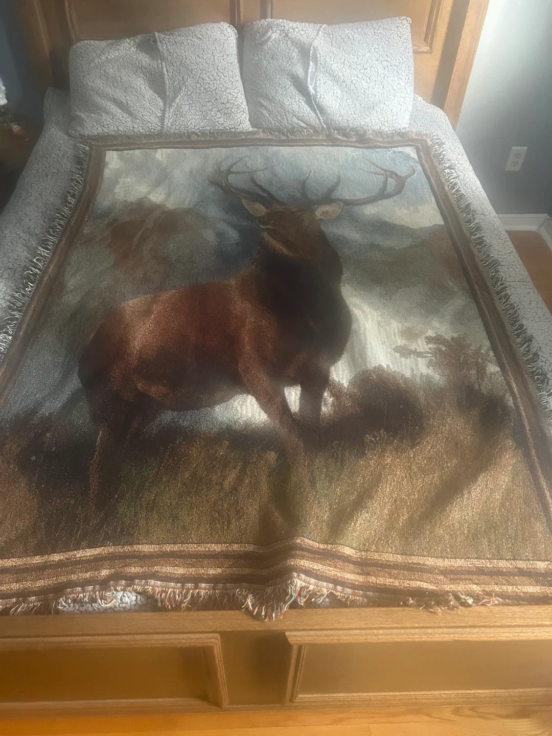 This is a woven wall hanging tapestry featuring an elk in a natural landscape. It has fringed edges for added detail. This piece would be a nice accent for a rustic or lodge-themed room. It's a beautiful statement piece!