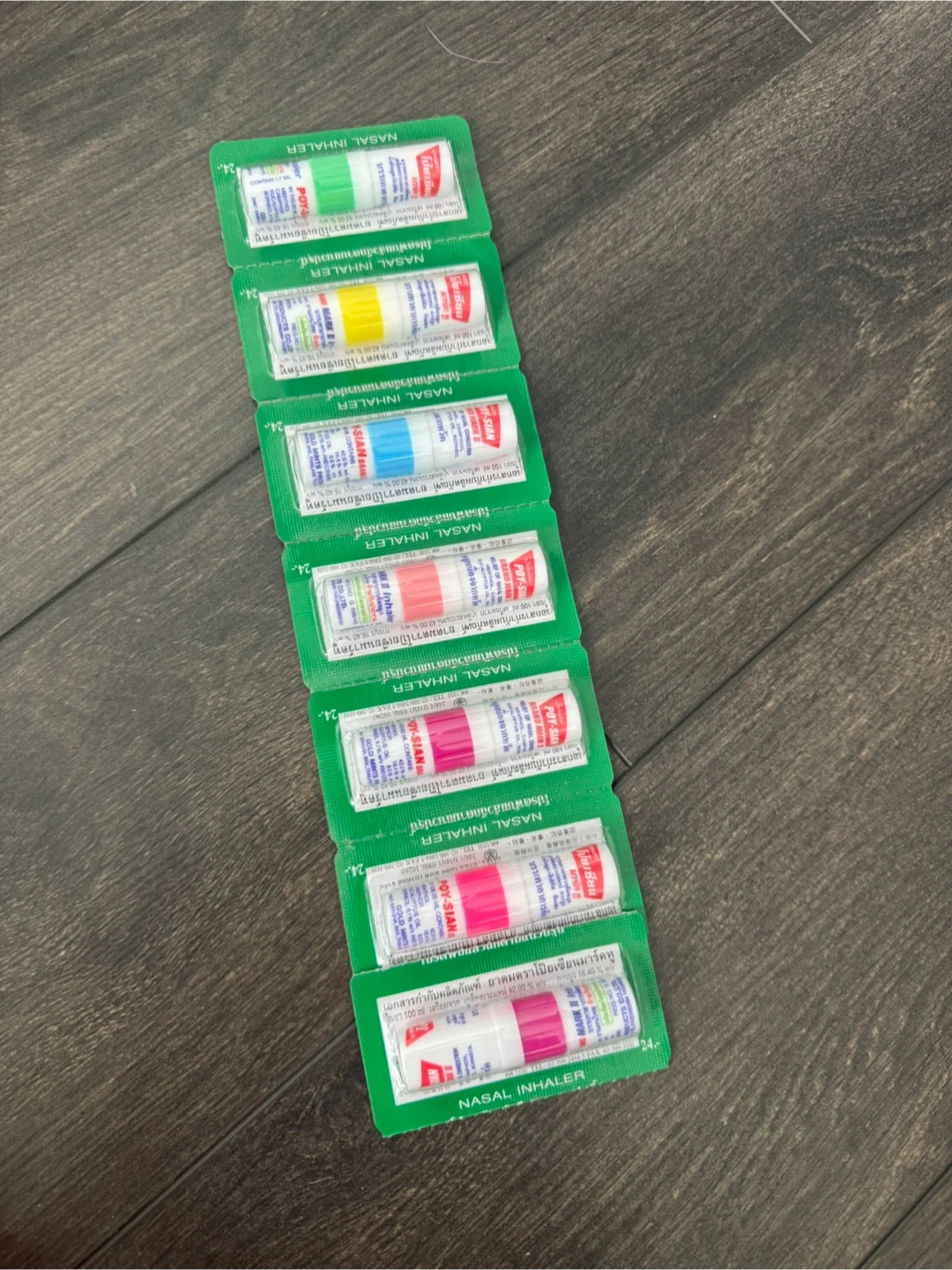 These are Hong Thai Compound Herb Inhalers. Each inhaler contains herbs and menthol.
