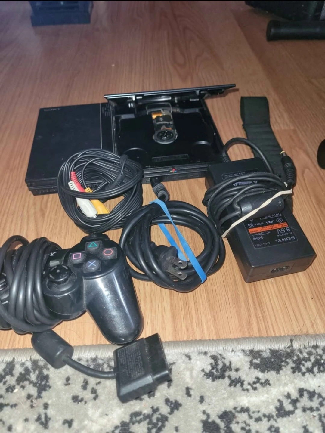 - The strap hold the lid shut - Everything Works - I'm downsizing for studies - Ps2 Slim With Controller, AV cable, Ac Adapter, 2 Prong AC Power Cord