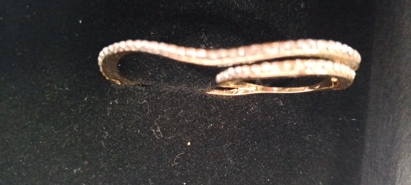 This unique two-finger ring is adorned with small, sparkling stones. It's designed to wrap around two fingers, creating a stylish layered look. A striking piece for adding some bling to any outfit!