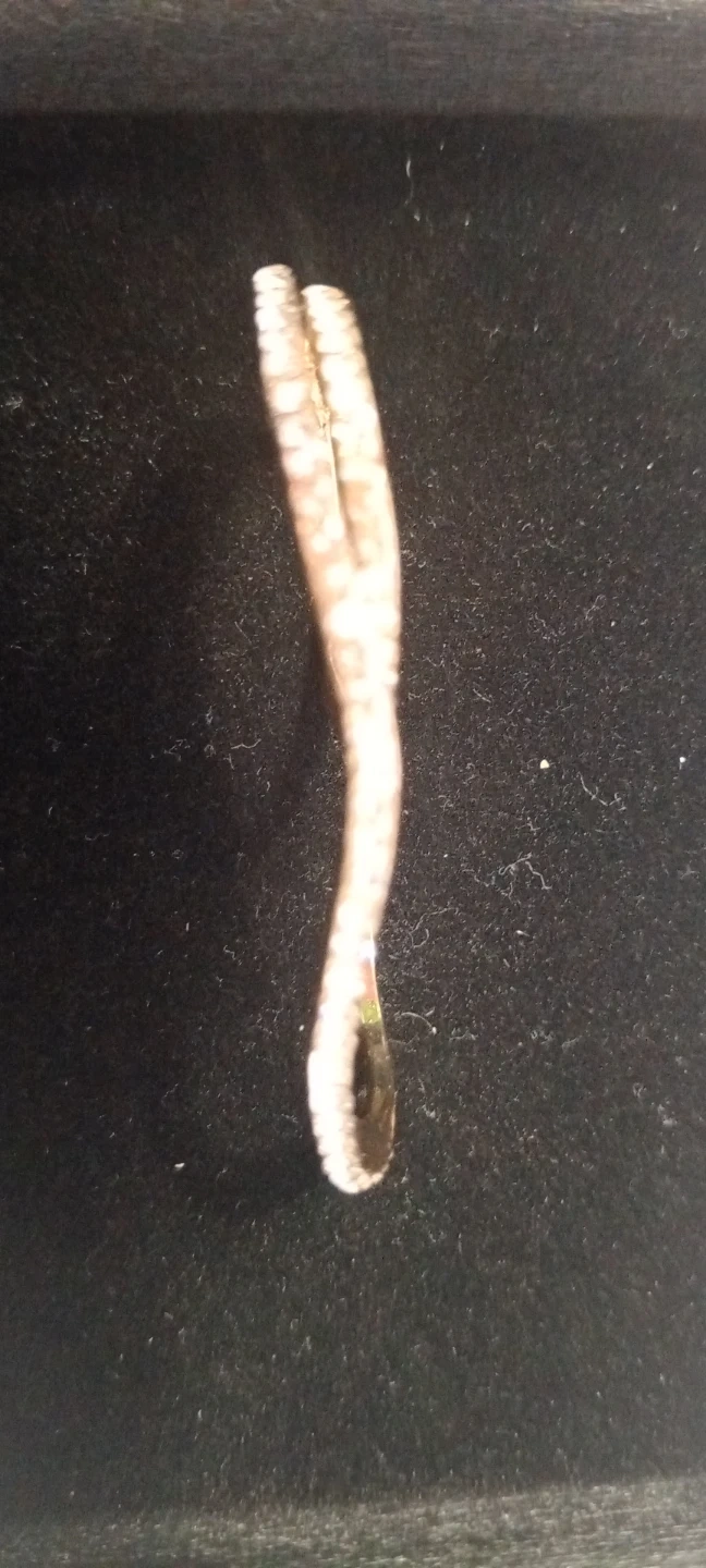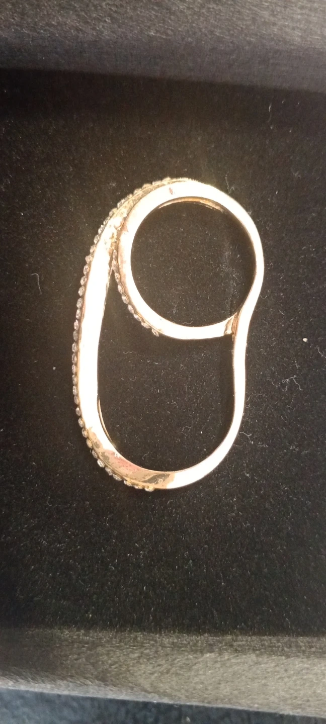 This unique two-finger ring is adorned with small, sparkling stones. It's designed to wrap around two fingers, creating a stylish layered look. A striking piece for adding some bling to any outfit!