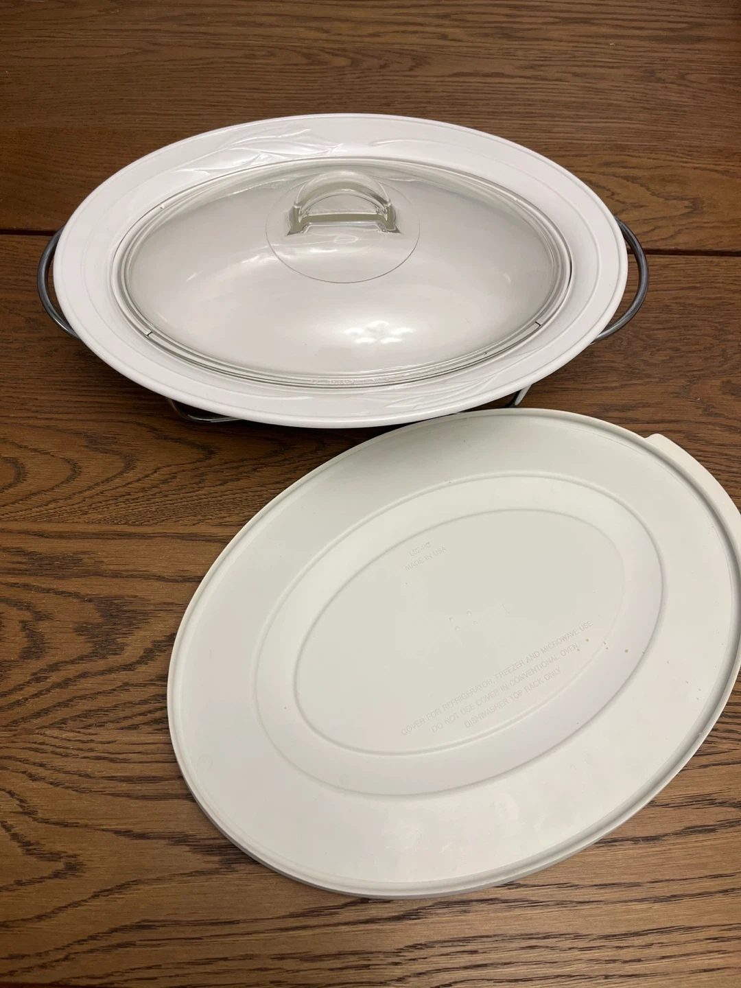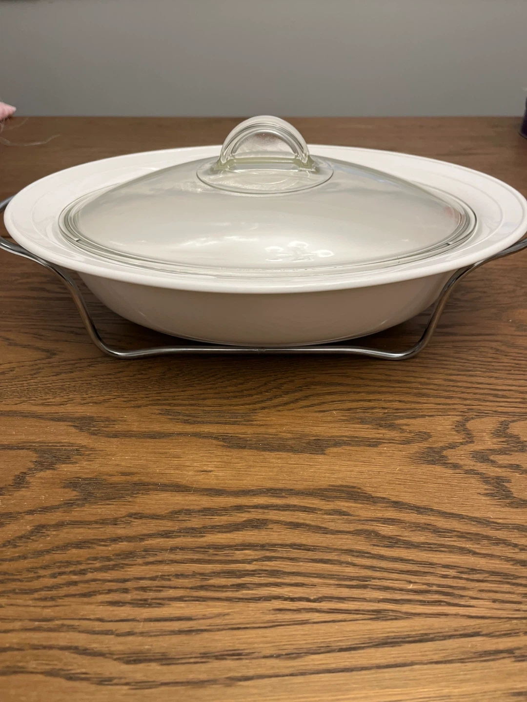 This white oval corning wear casserole dish comes with a clear glass lid and a metal stand with an extra cover. It's great for serving hot dishes at the table. Its oven, broiler, microwave and freezer safe.