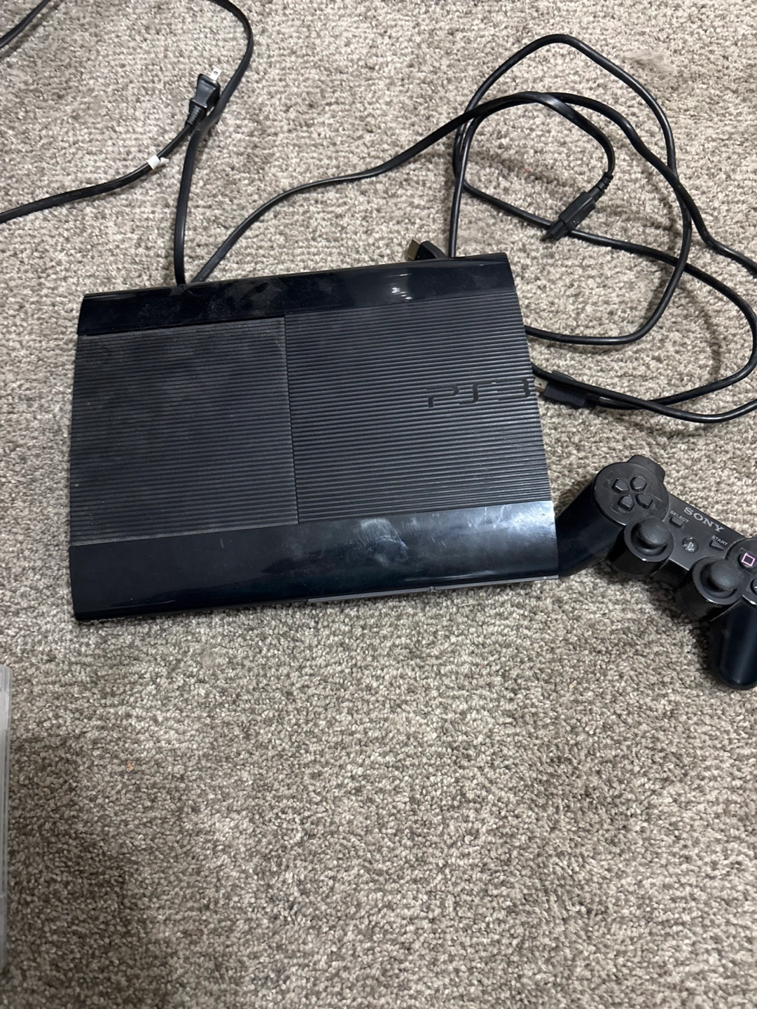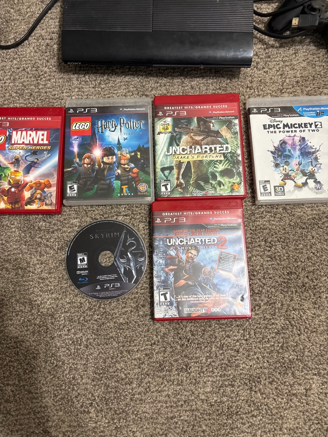 PS3 Console with one controller. Includes five games: LEGO Harry Potter Years 1-4, Uncharted Drake's Fortune, Disney Pixar Epic Mickey 2 The Power of Two, Marvel Super Heroes and Skyrim.