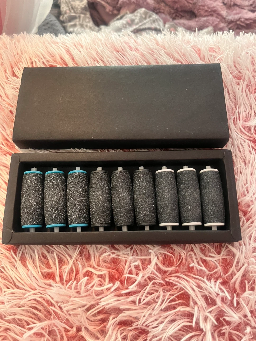 A set of ten replacement roller heads for a callus remover. Includes a storage box. These roller heads are designed for effective foot exfoliation. Pack of 9. They will fit the Foot Rollers from Shoppers.