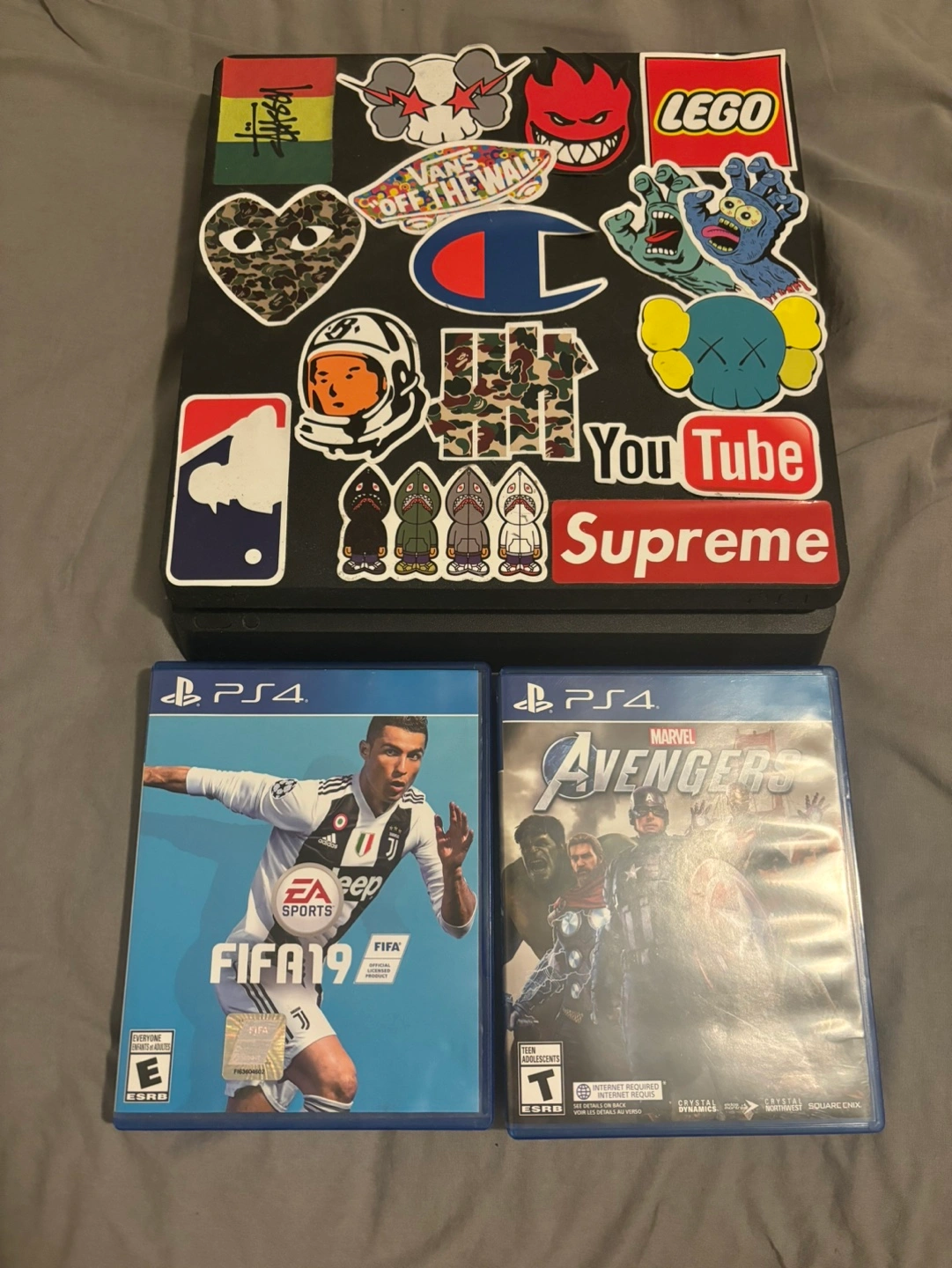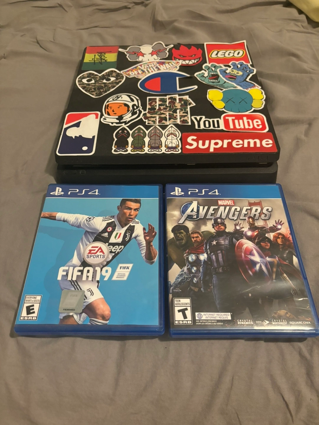 PS4 console with two games. Includes FIFA 19 and Marvel's Avengers. PS4 is used but in perfectly working condition!!! Got a laptop haven’t used it in a very long time! IS NOT LOUD!!!!!