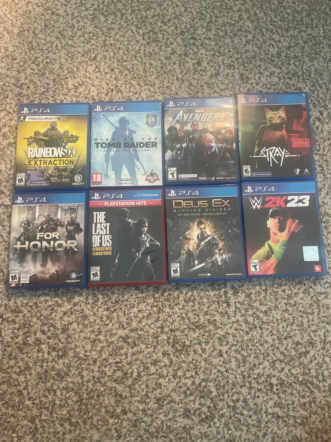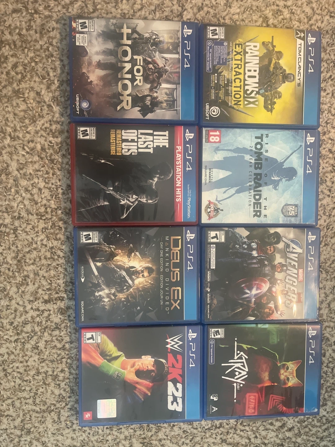 Selling a few PS4 games. Titles include: - The Last of Us Remastered- 15$ - Rainbow Six Extraction-10$ - For Honor- 10$ - wwe 2k23- 20$ - deus ex- 5$ - tomb rider 20th year celebration- 15$ - marvel avengers- 15$ - stray- 15$ All games are in great condition!