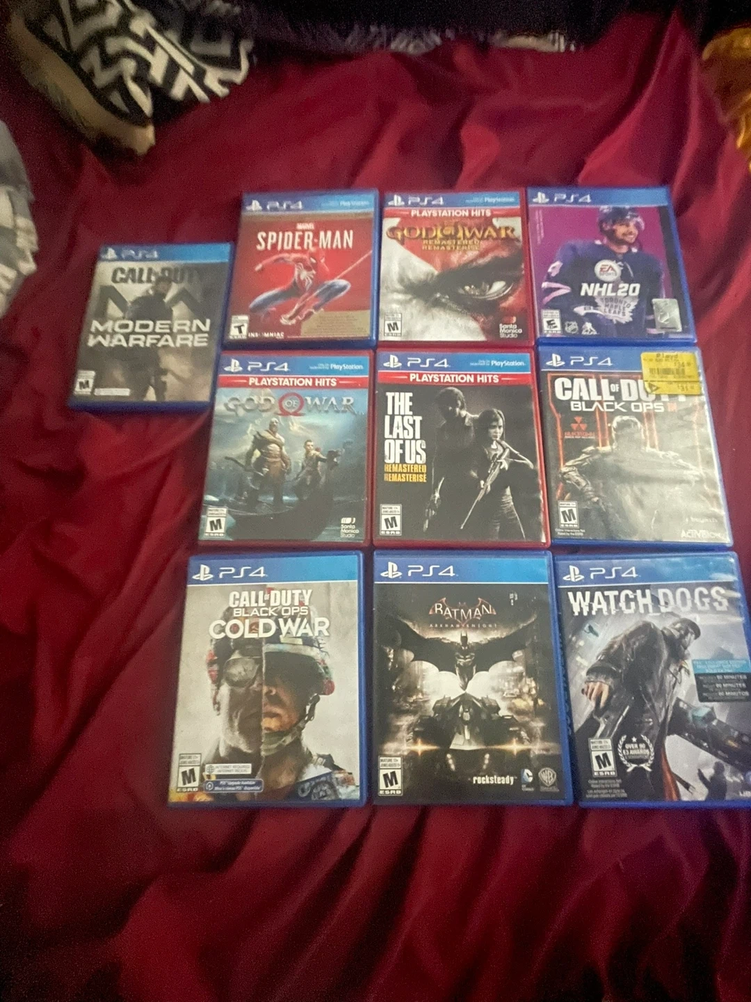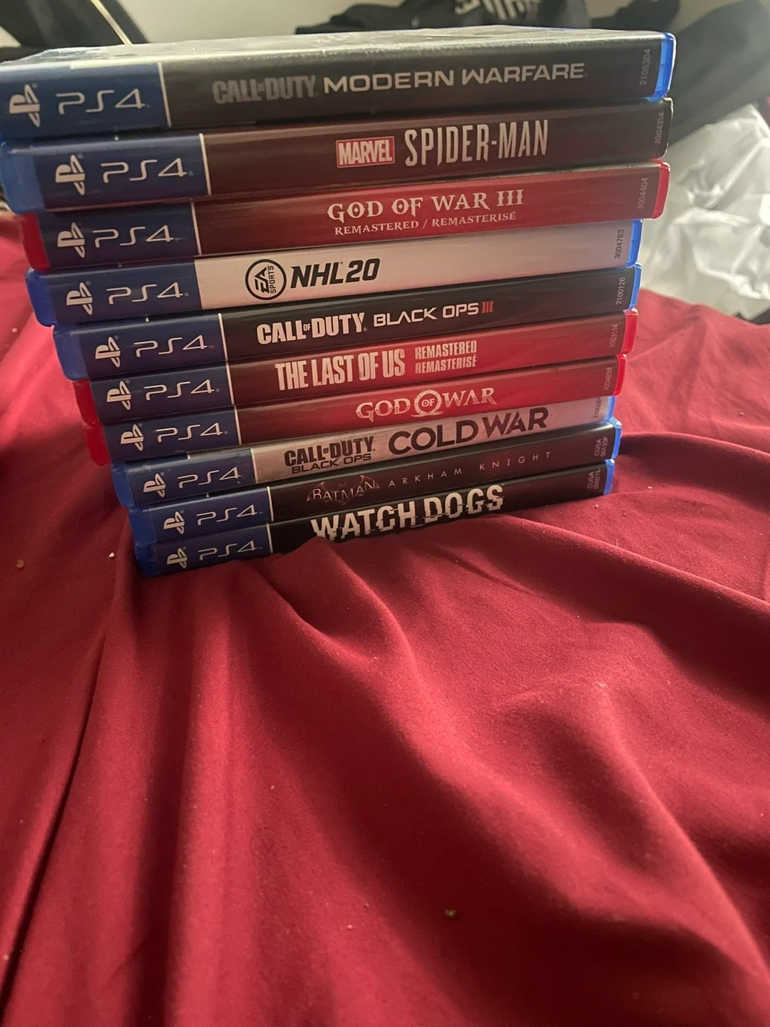 73Selling a collection of PS4 games in good condition! Includes titles like: - Call of Duty: Modern Warfare - Call of Duty: Black Ops Cold War - Marvel's Spider-Man - God of War III Remastered - The Last of Us Remastered - Batman Arkham Knight - Watch Dogs - NHL 20 - Call of Duty Black Ops